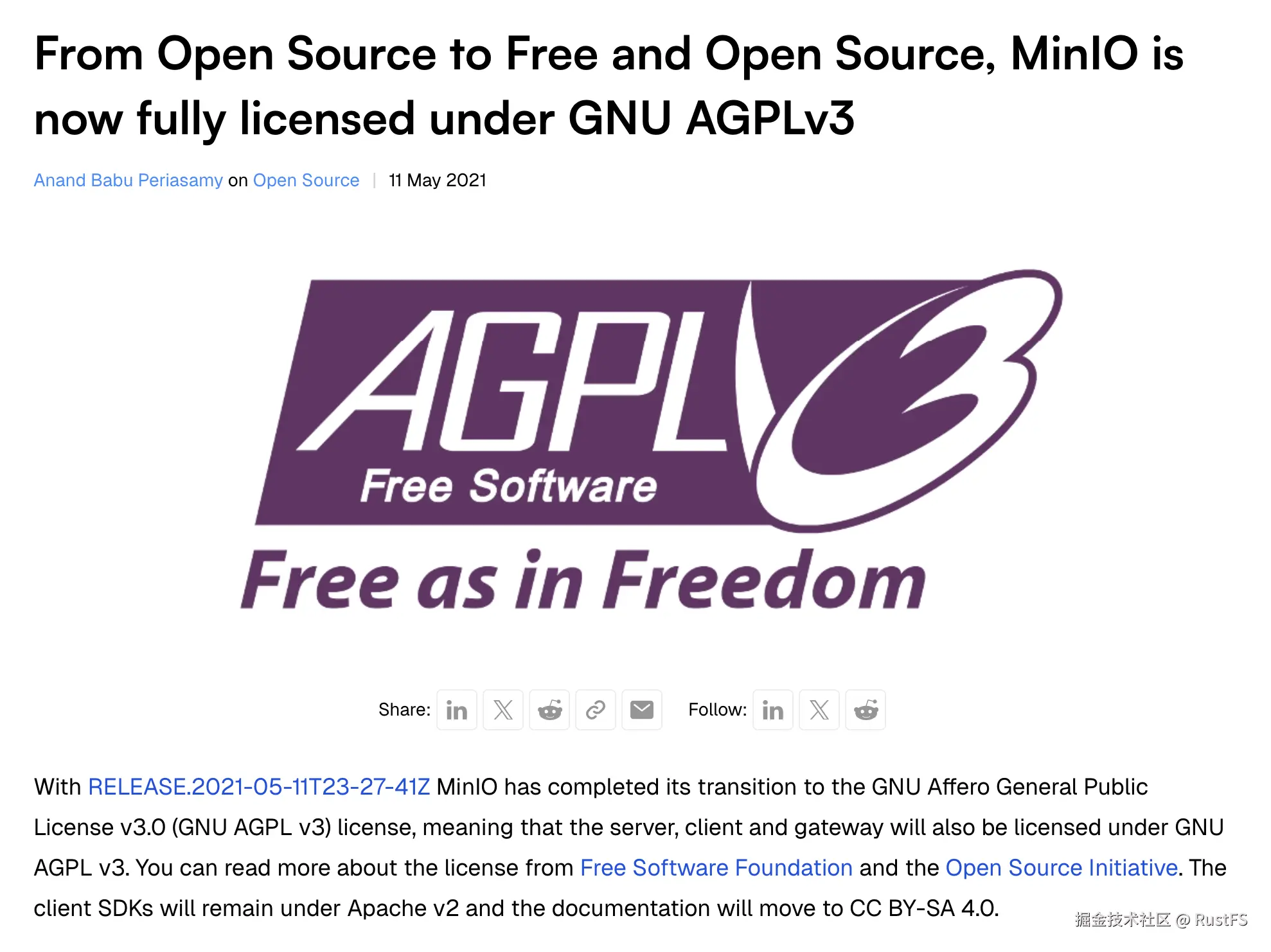 MinIO 刚发布的时候是以 Apache 2.0 为开源许可证,但是在 2011 年 5 月 11 日发布了一篇题为 From Open Source to Free and Open Source, MinIO is now fully licensed under GNU AGPLv3 博客,宣告 MinIO 从 Apache 2.0 转换为 APGL v3。