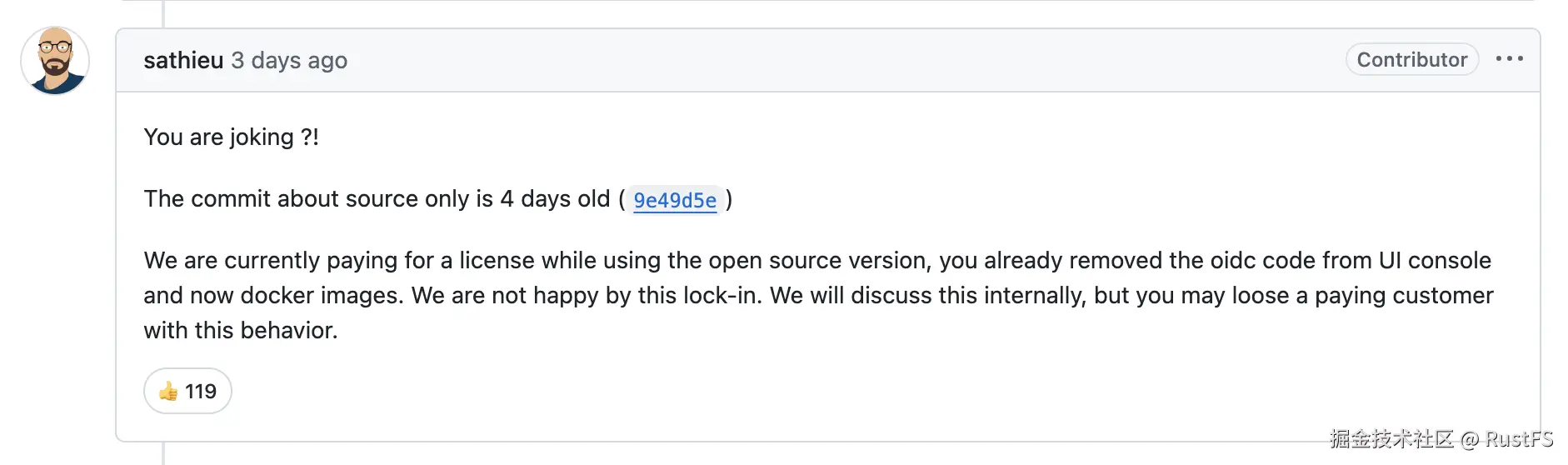 也有用户指出:你这不是扯淡么,你悄摸的修改了 README 文件,也不发个公告,当初你删除了 UI 控制台的部分功能,现在又对 docker image 下手了,这很让人气愤了,虽然我是付费用户,我都要寻找替代品了,哥不想被锁定。
