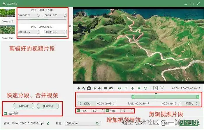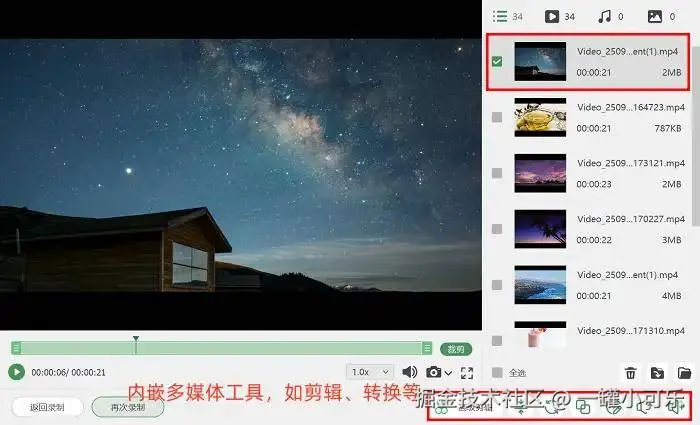 步骤3:录完之后要是瞅着有不满意的片段,不用再额外下剪辑软件!直接点击 “高级剪辑” 功能,就能剪去多余部分、调音量,还能加些转场特效(比如淡入淡出),让视频过渡更丝滑。