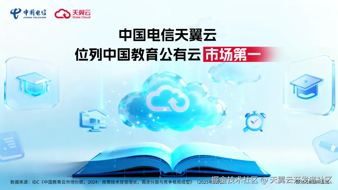 近日,国际数据公司IDC发布的《中国教育云市场份额,2024:政策技术双驱增长,需求分层与竞争格局成型》(Doc# CHC53785125,2025年10月)报告显示,中国电信天翼云以16.38%的市场份额位居中国教育公有云市场第一,凭借领先的产品、解决方案以及高效的服务,展现了在教育云领域的强劲科技实力与市场领导力。