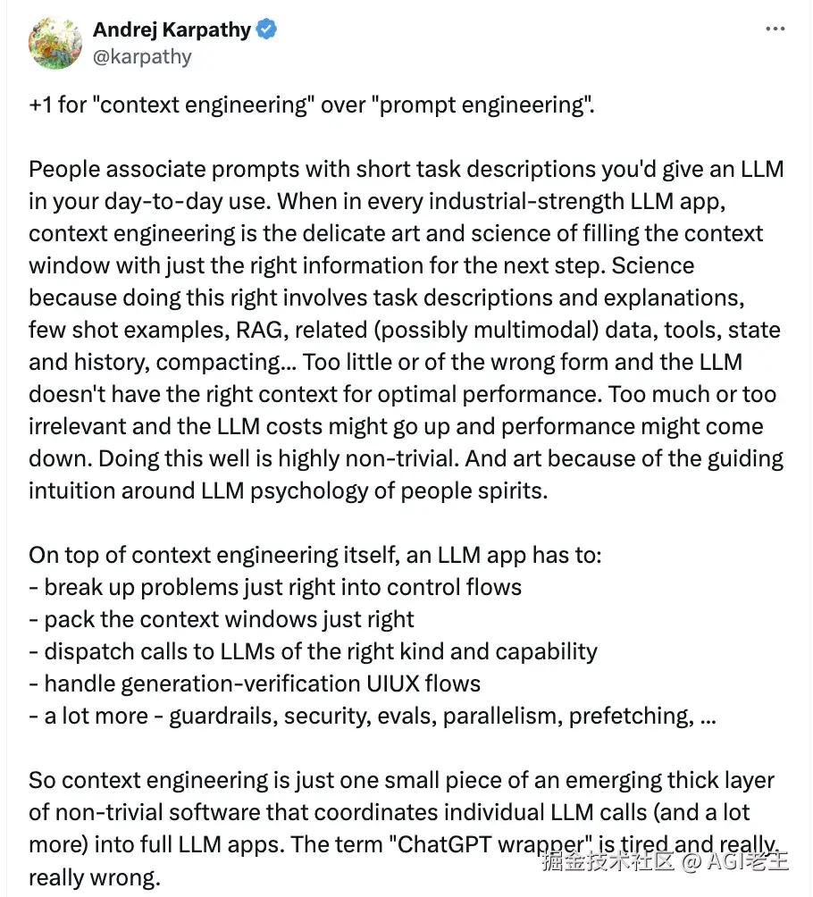 有些大佬也给出了一些理解:上下文工程它是一个类似于机器人的一个综合性、交叉专业的AI系统工程,它也是人工智能系统设计领域的下一次重大进化,从复杂度、效果、落地等角度来说,远远超越了传统的提示工程。但是它也只做两个核心的事:设计并优化指令和相关上下文管理。这两件事做好,足以使大型语言模型(LLMs)和高级 AI 模型能够有效地完成各种复杂任务。从更大大范围地定义,Context Engineering是对环境、输入数据和交互流程的设计,因为这些是系统必不可少的部分,都会影响 AI 系统的运行以及效果。