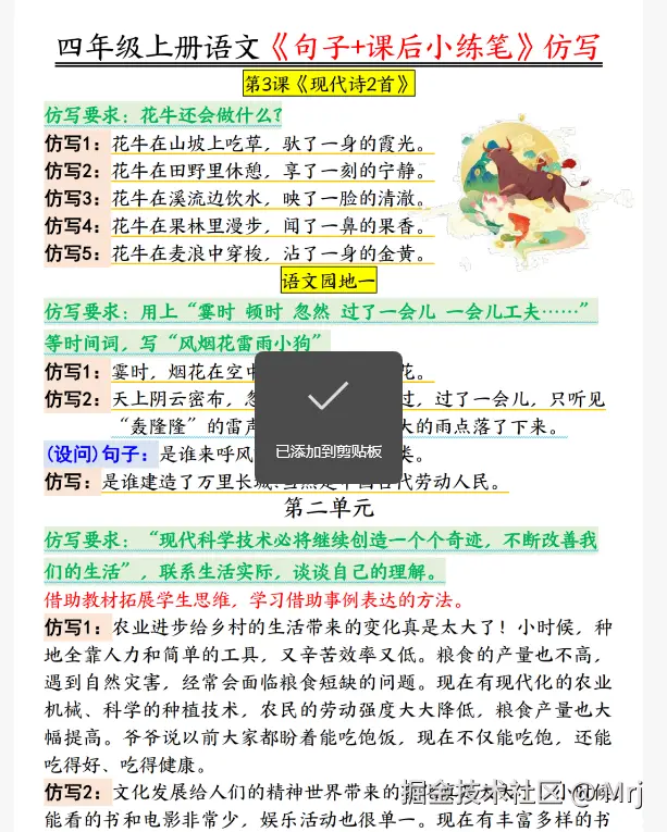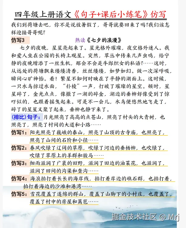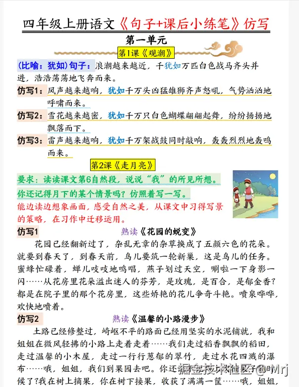 四年级上册语文写作想要提分,句子仿写和课后小练笔是关键!这份《句子 + 课后小练笔》仿写汇总超实用,覆盖课本内比喻、拟人等句式仿写,还有《观潮》《走月亮》等课文的课后小练笔范例。