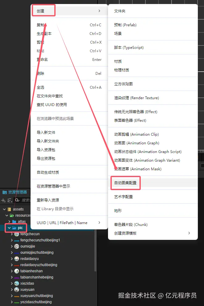 我们可以通过右键要使用自动图集的图片目录-创建-自动图集配置使用。