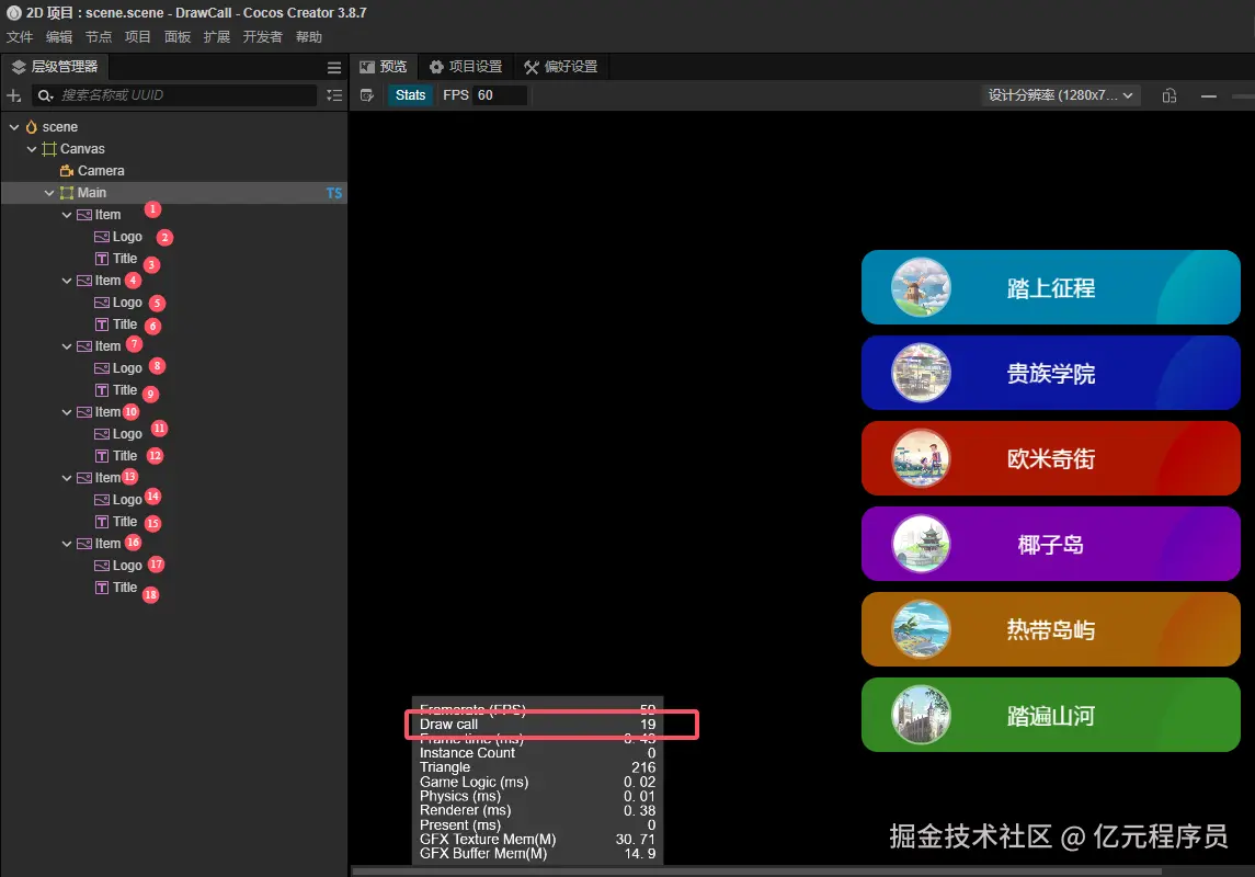 图集处理好之后运行看下效果,使用图集之后,DrawCall降低到13个了。