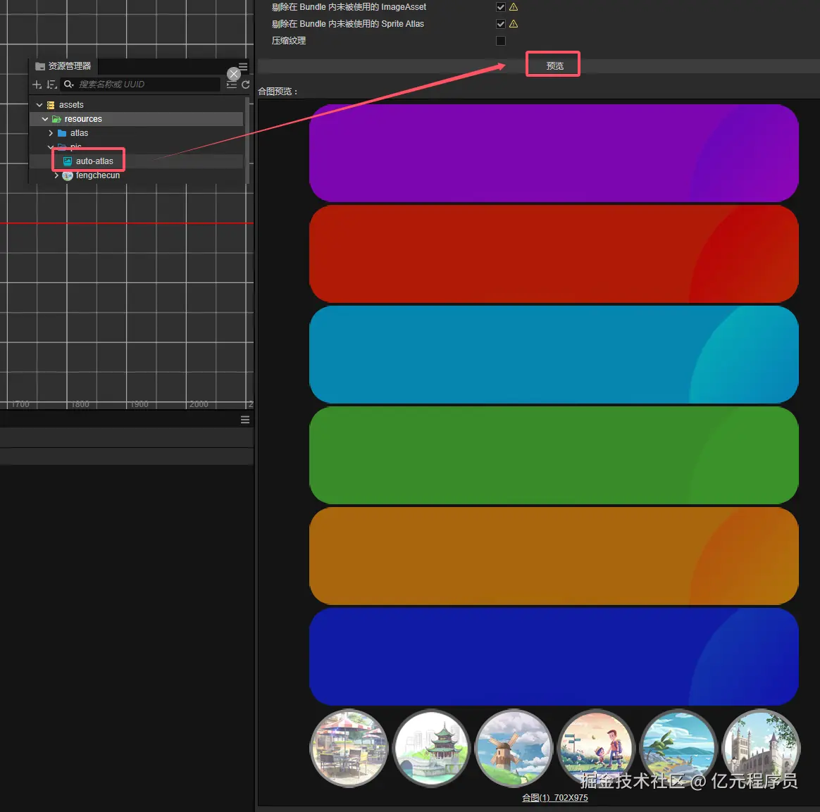 自动图集 作为Cocos Creator自带的合图功能,可以将指定的一系列碎图打包成一张大图,具体作用和TexturePacker的功能很相近。