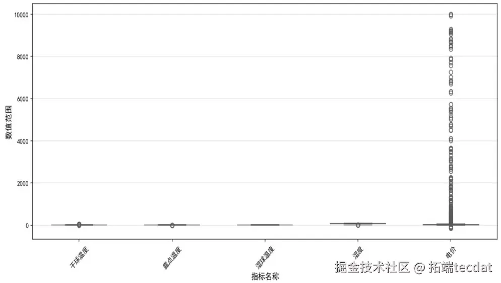 进一步绘制箱线图检测异常值,下图显示电价呈严重右偏分布(75%数据集中于0-2000),湿度存在量纲异常(范围0-2000,正常应为0-100),经IQR处理后得到修正相关系数矩阵,保留相关系数绝对值>0.25的因子(温度、湿度、电价)。