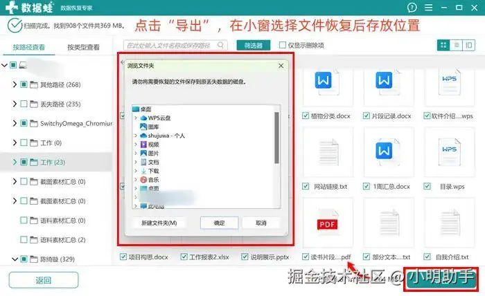 步骤3: 选好文件后点击“导出”,再选择文件恢复后存放的位置,完成专业恢复数据的操作。