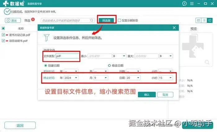 步骤2: 该软件的扫描模式为先进行快速扫描再深度扫描,所以找出来的文件可能较为全面量多:找不到目标文件也没关系,试试选择文件区域上方的“筛选器”或“搜索框”;