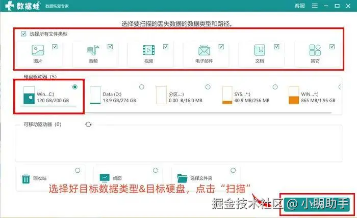 步骤1: 进入软件的首页,根据页面中间的提示,完成数据类型和扫描位置设定后,按下“扫描”按钮: