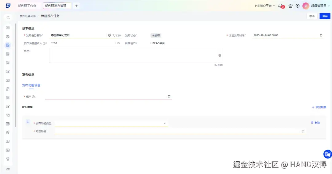 - 可视化配置:通过直观的界面配置发布任务,灵活选择发布功能(支持领域、业务对象、页面、事务处理流、脚本事件、数据迁移),目标租户及发布时间。