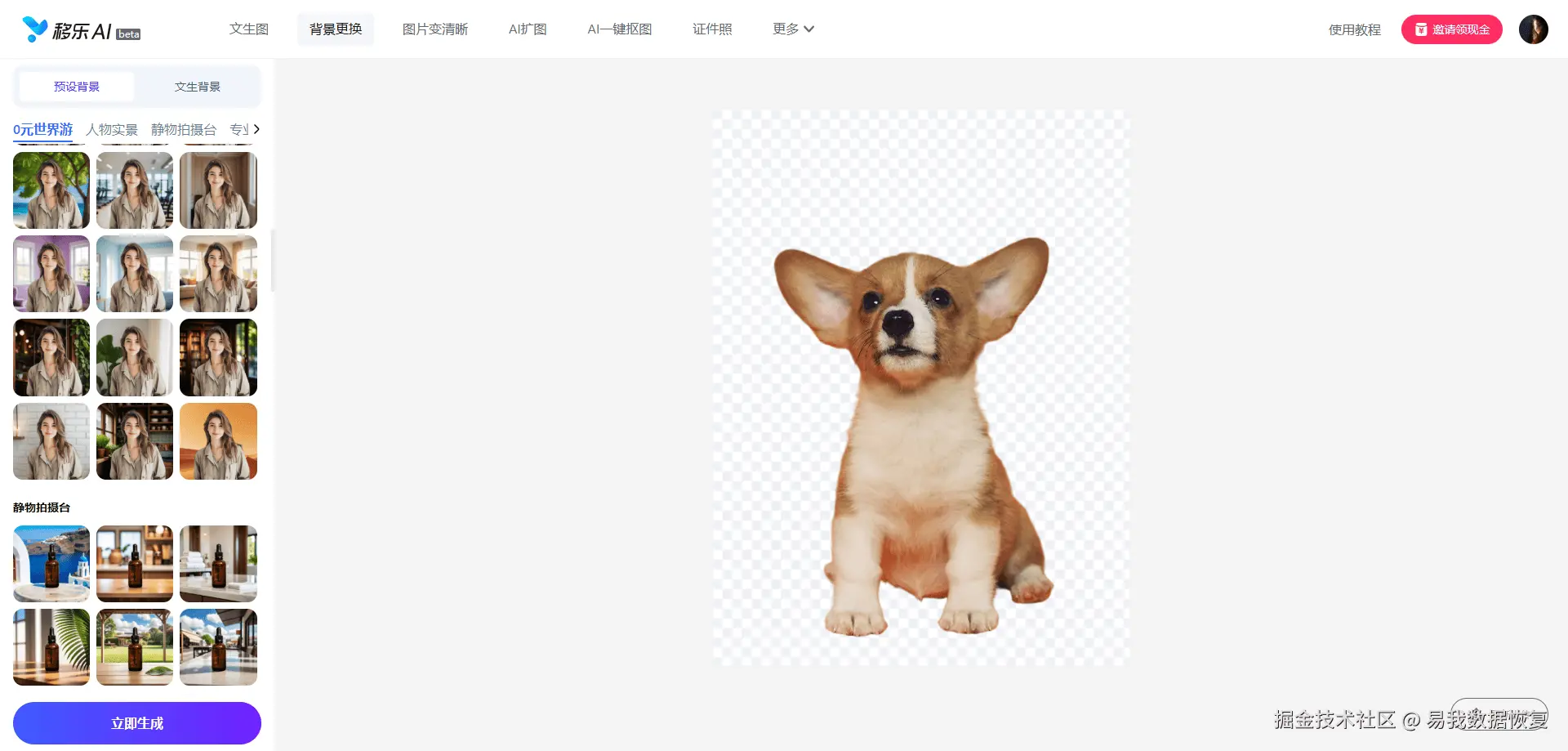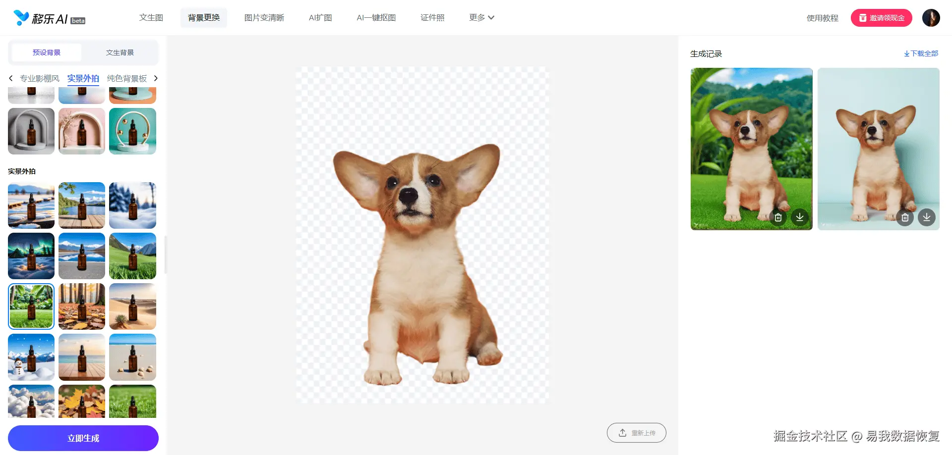 3.选择左侧预设背景库里的背景,或文生图背景,确定后点击“立即生成”,等待约10秒,右侧会显示重新生成背景的图片,无误可直接下载无水印高清图,也可以重新选择背景图再次生成。