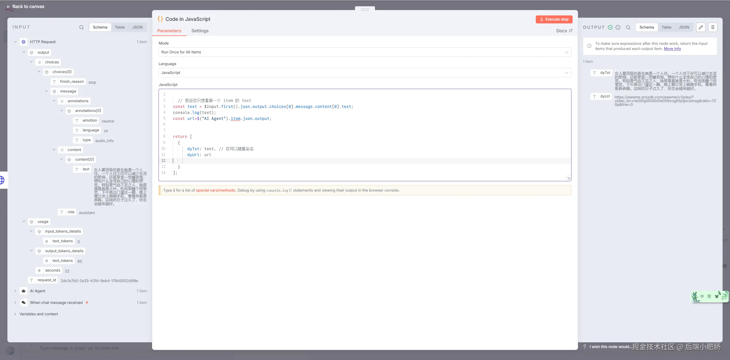 Code in JavaScript : HTTP Request节点后点击【+】,添加Code in JavaScript节点。这个节点的作用是获取前置节点中的抖音视频地址和抖音文案,拼接组合返回最终结果。