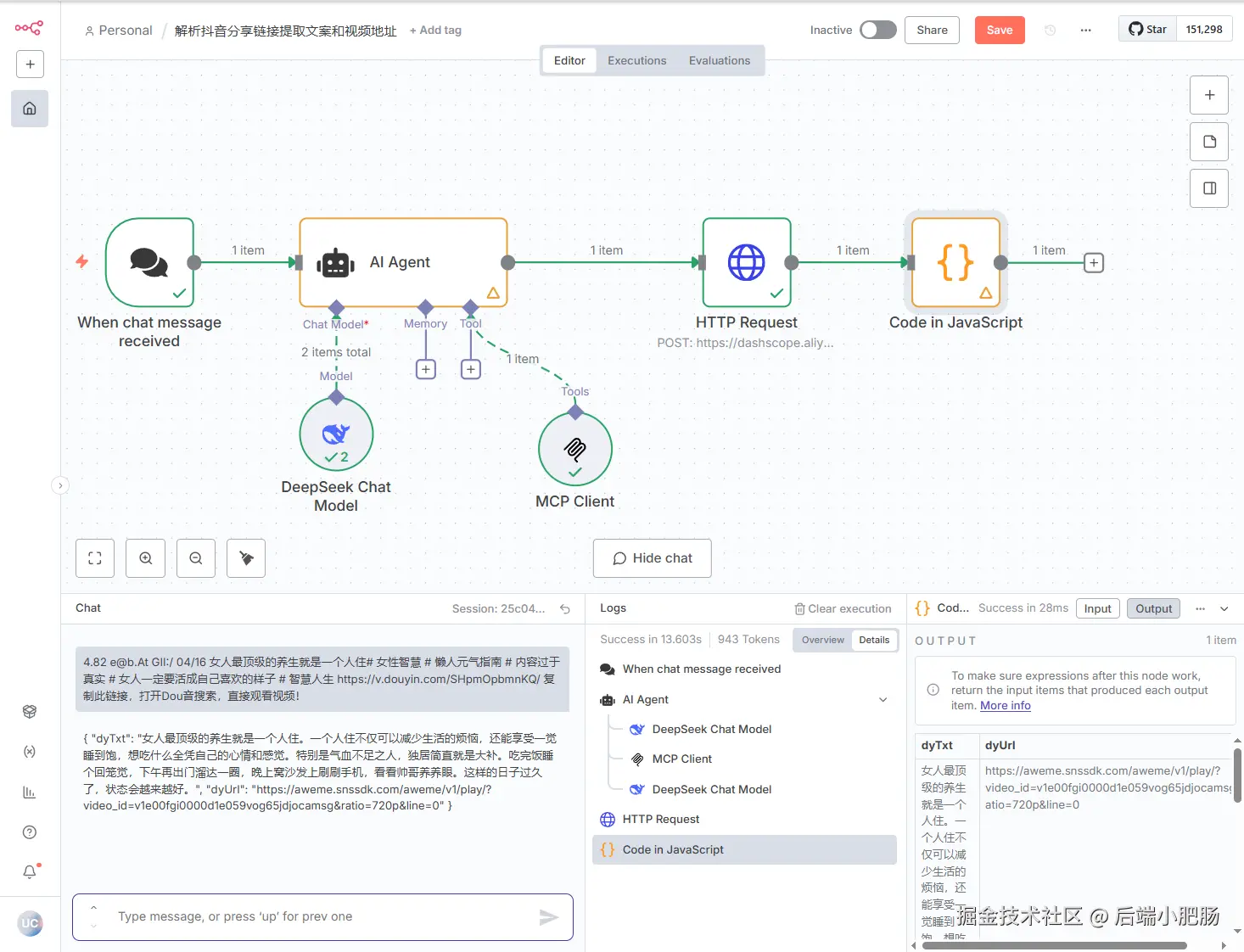 在这篇入门教程中,我们成功搭建了一个非常实用的 n8n 工作流。通过结合使用 AI Agent 节点(以 sse 方式调用抖音 MCP 服务)和 HTTP Request 节点(调用通义千问3-ASR-Flash模型),我们实现了一个完整的自动化流程:从一个简单的抖音分享链接开始,最终成功提取出了无水印的真实视频地址和视频中的文案。