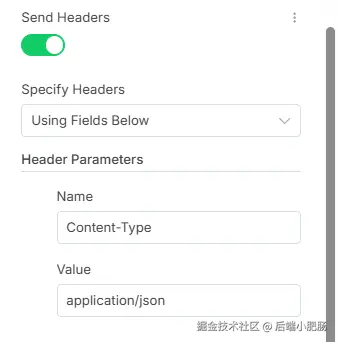 打开Send Headers。Specify Headers选择Using Fields Below。Header Parameters项中Name填入Content-Type,Value填入application/json。