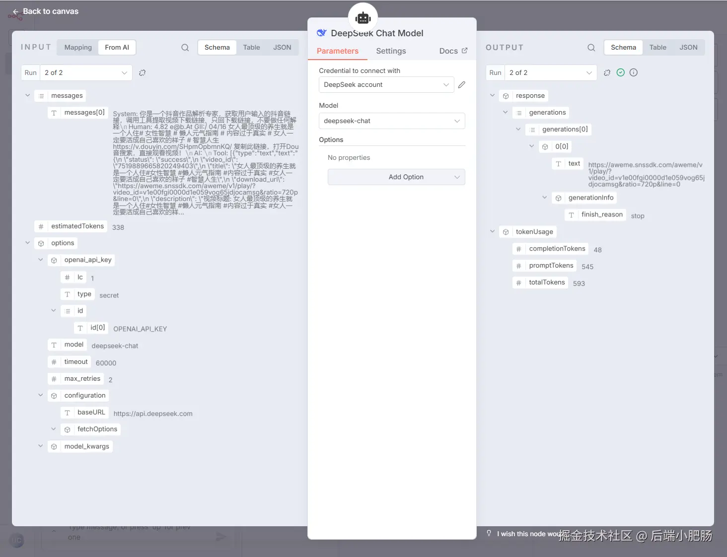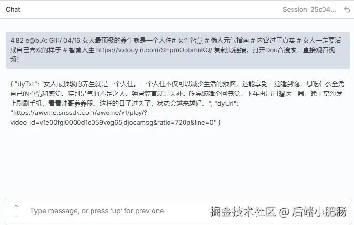 回到工作流主界面点击底部【Open chat】按钮,在聊天框输入任意抖音视频作品分享链接,等待几秒钟就能看到视频的真实地址和文案被提取出来了: