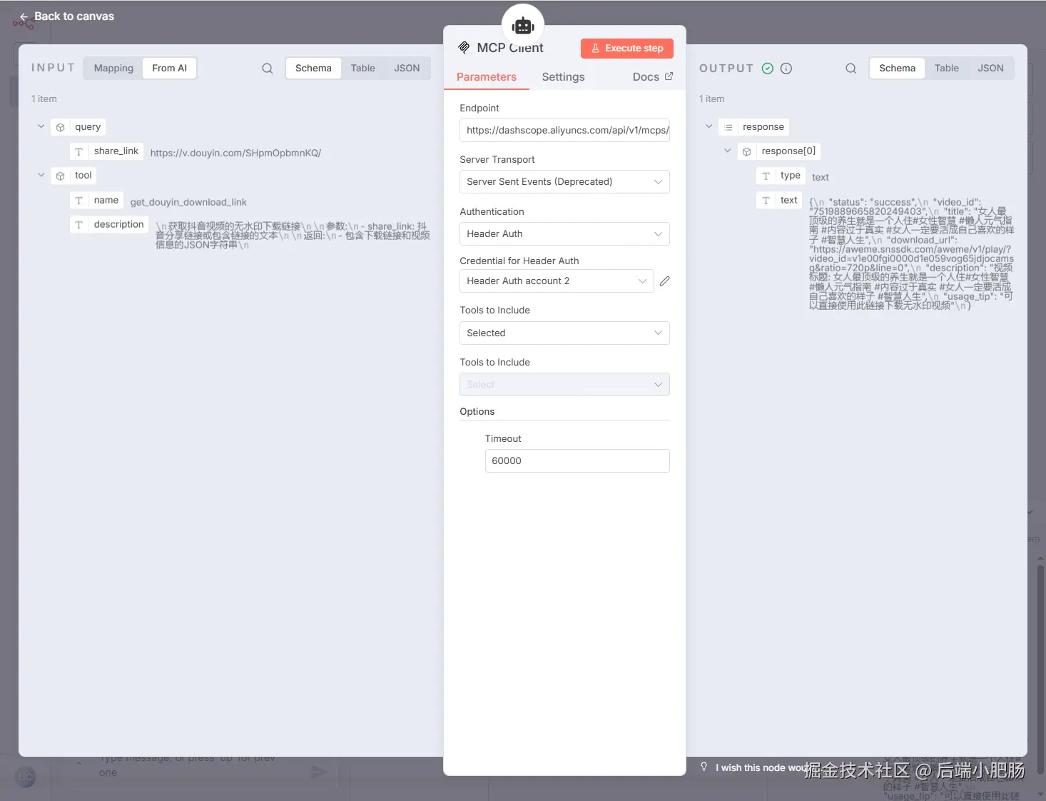 这种方式适合n8n部署在本地的情况,如果部署在容器里就需要想办法把mcp server也部署在容器,这种方式会在后续文章提取抖音链接解析信息写入 飞书中介绍。
