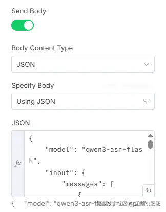 HTTP Rrquest: AI Agent节点后点击【+】添加HTTP Request。这个节点的作用是基于前置AI Agent节点输出的真实视频地址调用通义千问3-ASR-Flash模型来提取视频中的文案。