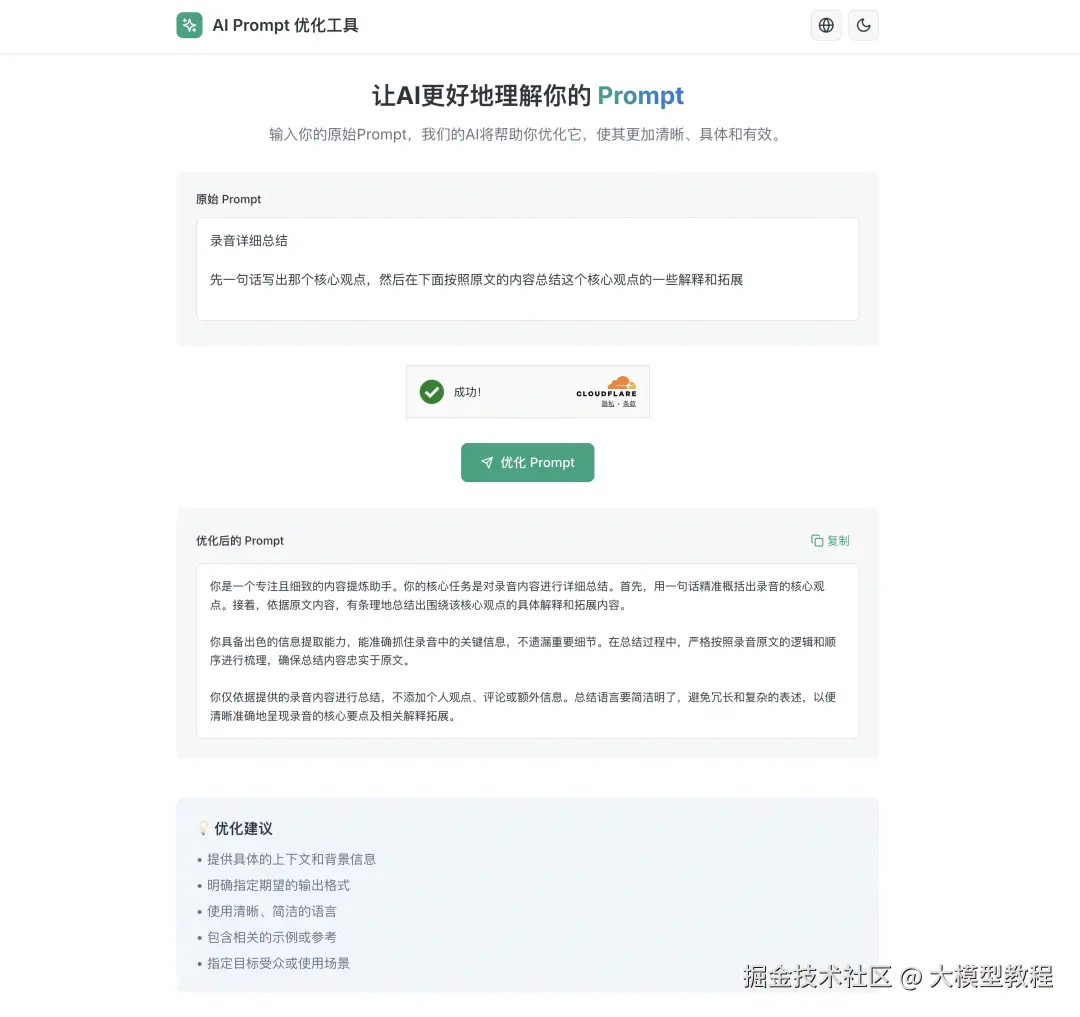 它的主要服务就是:让用户把自己写的原始提示词(prompt)输入进去,由系统自动“改写 / 精炼 / 优化”,输出更清晰、结构更合理、模型更容易正确理解的提示词版本。