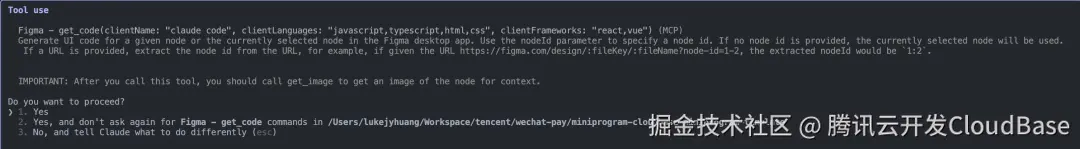 输入后,Claude 会调用 Figma MCP Server 的 get_code 工具读取设计稿细节(如下图),然后 Claude 会进行前端交互的还原开发了