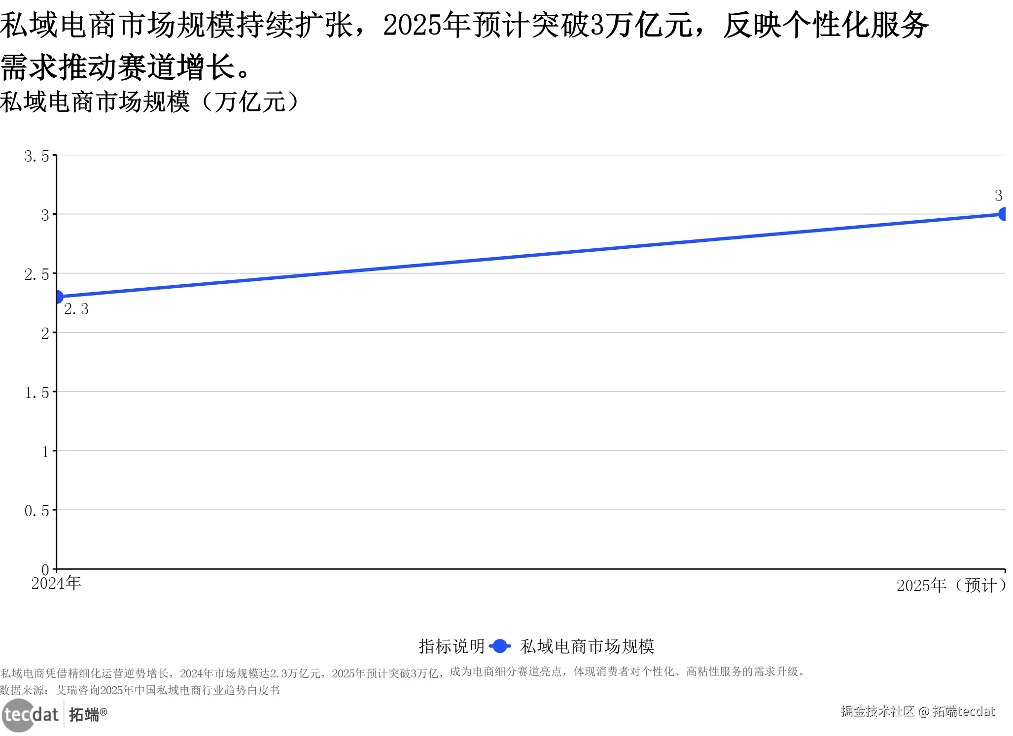 | 私域电商 | 2025年预计规模3万亿元 | 艾瑞咨询《2025年中国私域电商行业趋势白皮书》 | 全品类商家、创业者 |