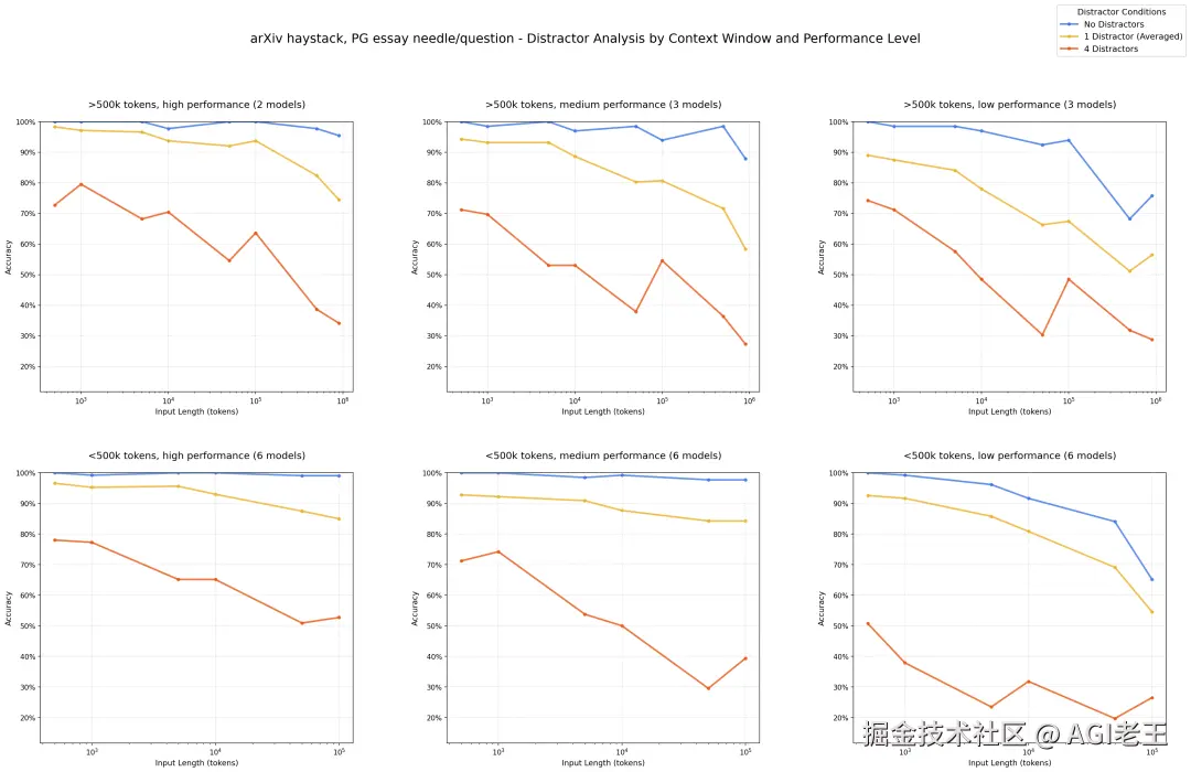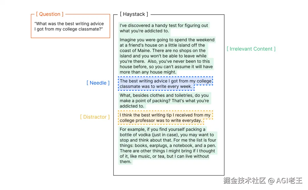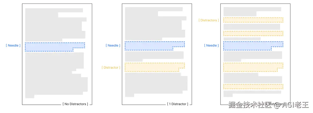 上面这个Needle就是正确的答案所在的位置,而Distractor是分散注意力的文本,也就是和答案有一定相似性的内容,而其他绿色部分则是完全不想关的内容。基于这个可以增加更多的干扰文本,如下图,分别表示不同数量的干扰文本。