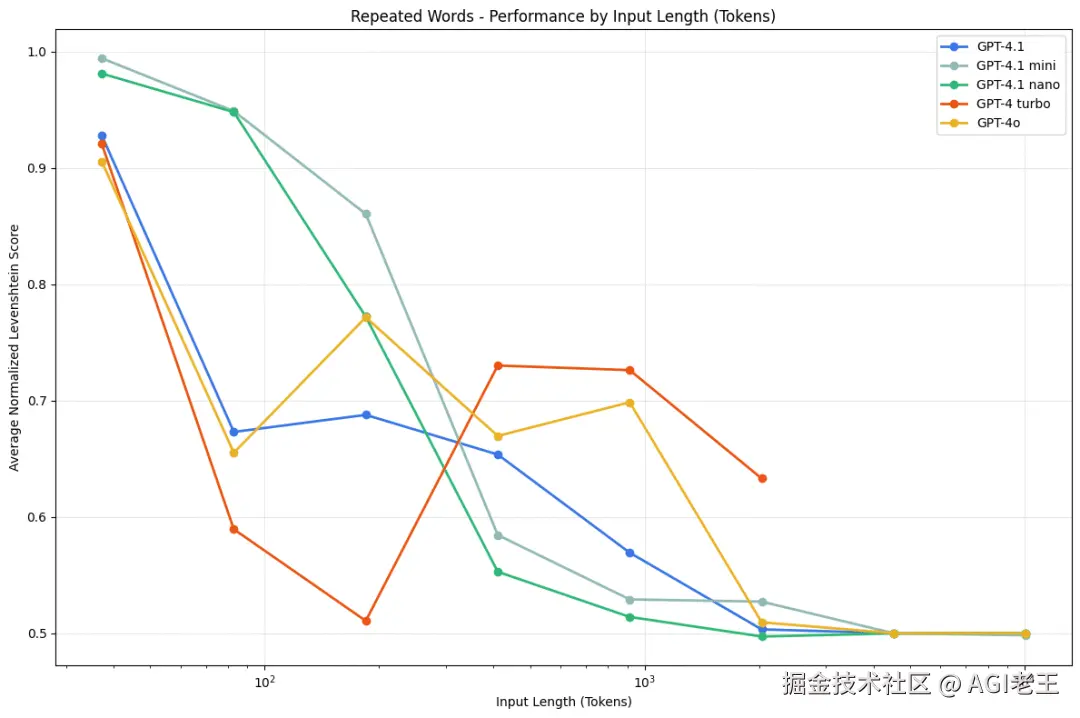 大模型处理过程中,可以看到随着输入的长度增加,输出的效果呈现下降的趋势,也就是模型无法正常输出输入的文本了。可以观察长上下文对于模型效果的影响。