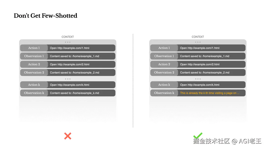 之前我也分析[5]过,Manus分享的这篇AI Agent的上下文实践的文章[6]中提到,AI Agent实践中使用少样本提示(Few-Shot)需要谨慎: