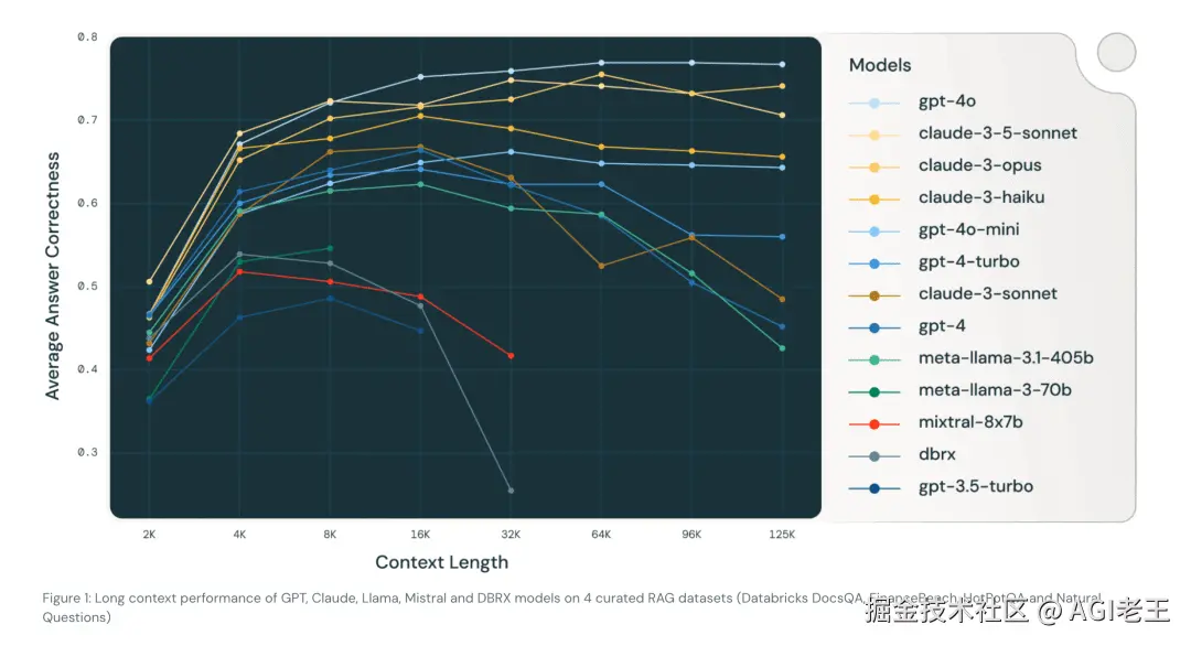 Databrcks有一篇研究[8]给出了一些有趣的结论:使用更长的上下文并不总能提升RAG的表现。