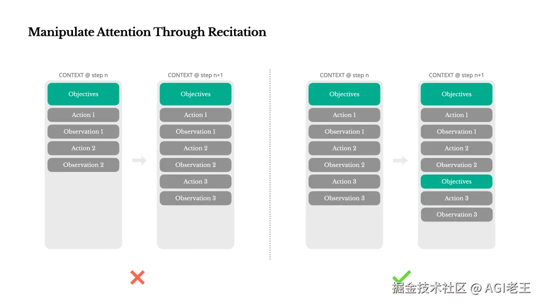 通过不断地重写这份待办清单,Manus 实质上是在将任务目标“复述”到上下文的结尾处。这样做可以把全局计划强行推入模型最近的注意力范围,避免“上下文中段丢失”问题,同时减少目标偏移。换句话说,它是在用自然语言主动引导模型关注核心任务目标——无需修改模型结构,就能实现注意力的偏置。