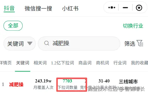 "减肥操"这个词,搜索量虽大,但它的下拉词有超过7000,太多了,虽然竞争度相对较小。
