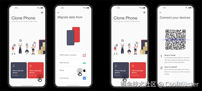 步骤3. 在您的OnePlus手机上,打开“克隆手机”应用程序,选择“这是新设备”,然后选择“iPhone”作为旧手机的类型。