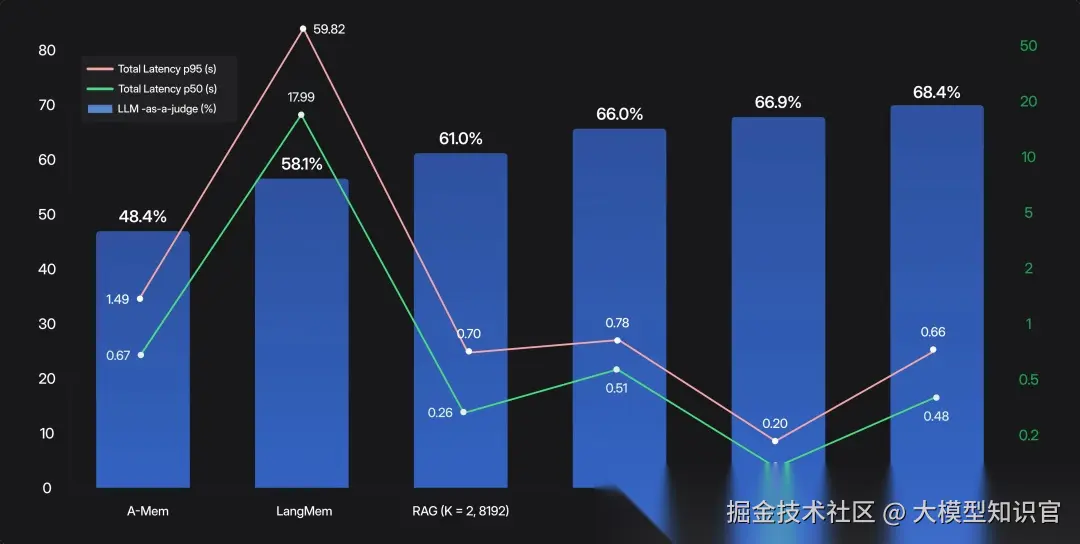 - Mem0ᵍ 在保持低延迟的同时,将准确率进一步提升至 68.4%。