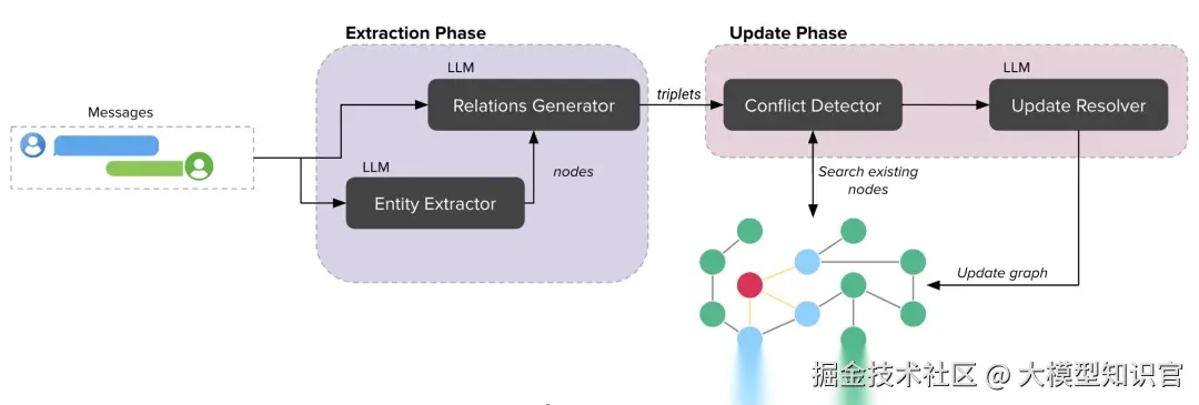 - 实体提取器(Entity Extractor):识别对话中的实体(如“用户”、“产品A”)作为图节点;