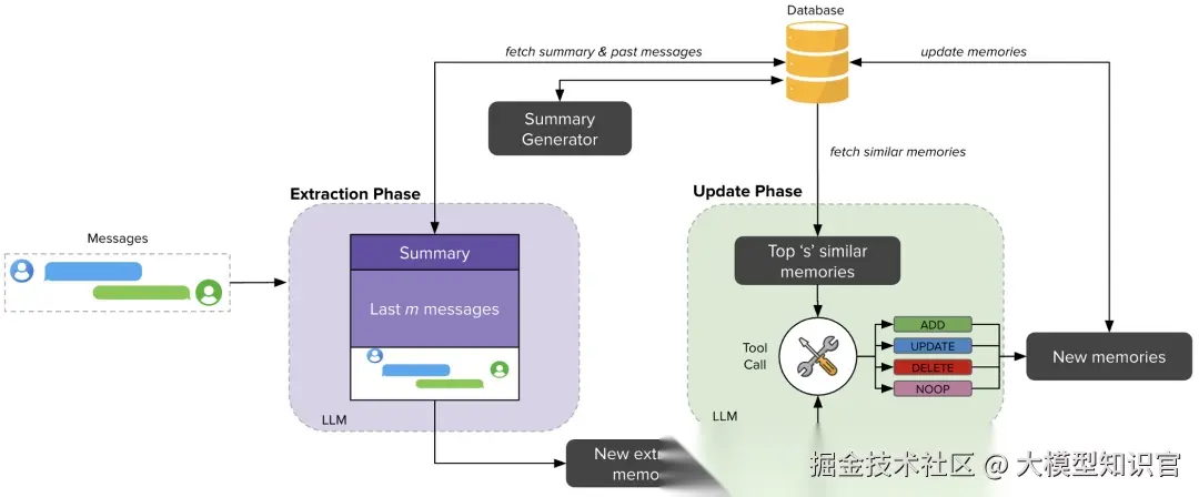 通过一个 LLM,将这些内容压缩为简洁、结构化的候选记忆事实(如“用户偏好咖啡而非茶”)。 同时,一个后台异步模块持续更新长期摘要,避免阻塞主推理流程。