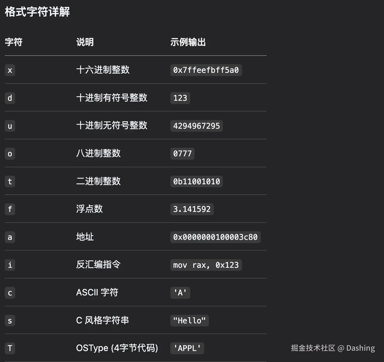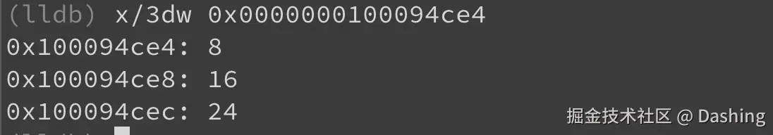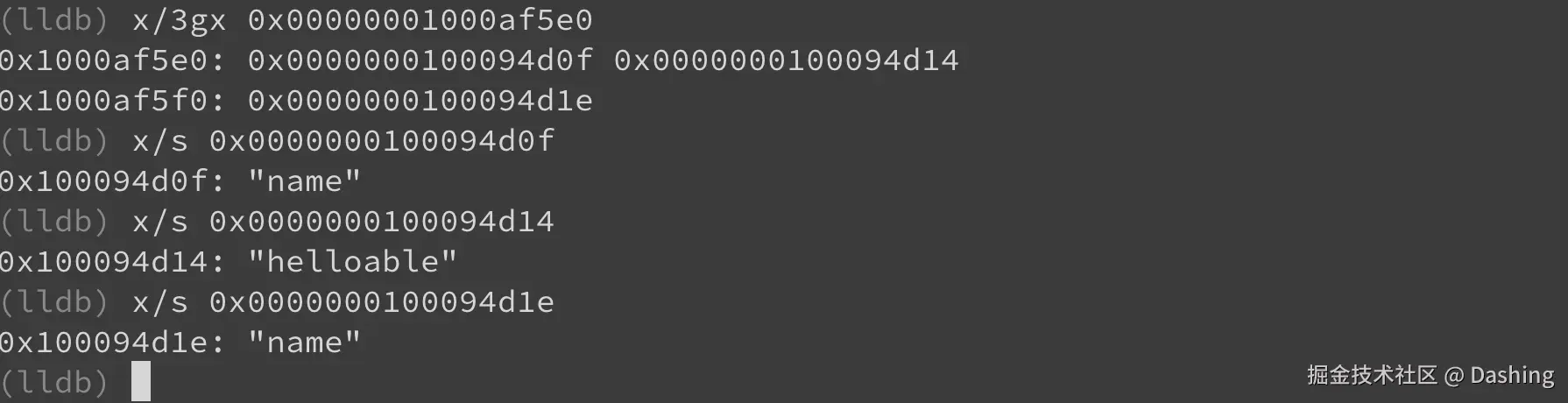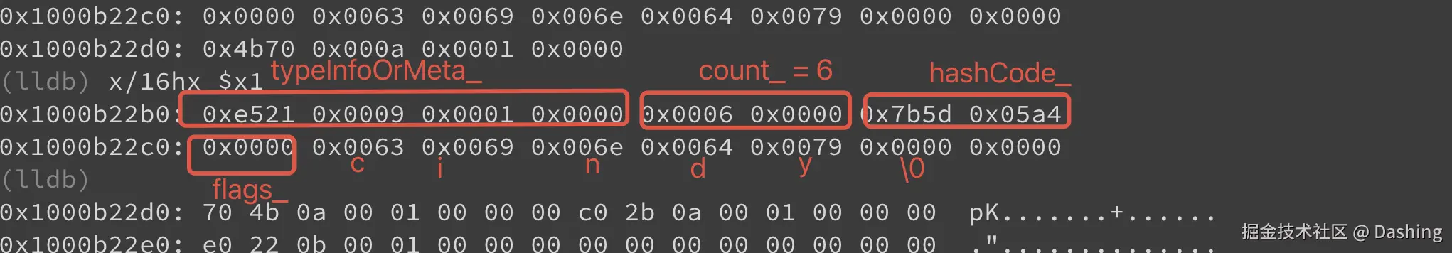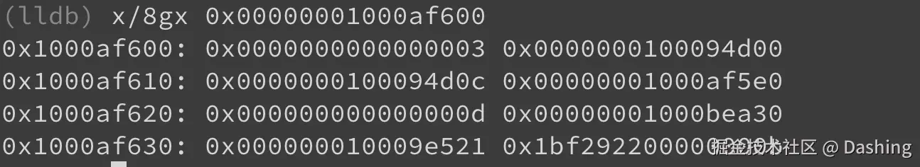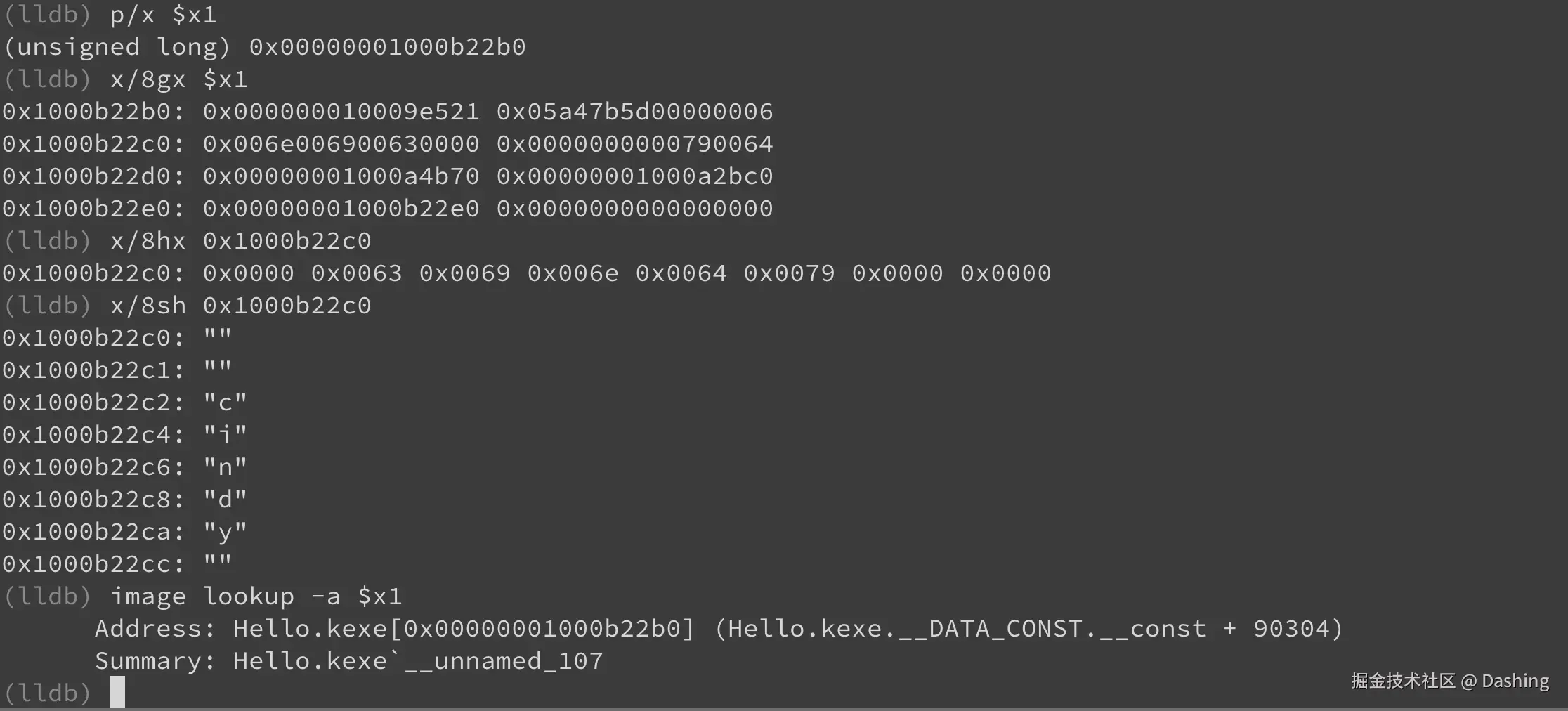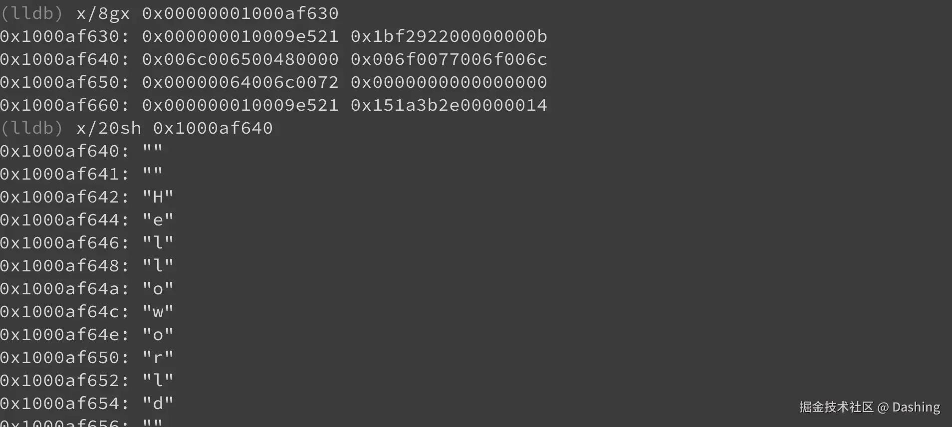 ● x/8hx 0x1000b22c0 读取0x1000b22c0地址对应的内存中的内容 h:两个字节为一组 x:以16进制显示 重复 8 次 似乎看到了ASCII 吗