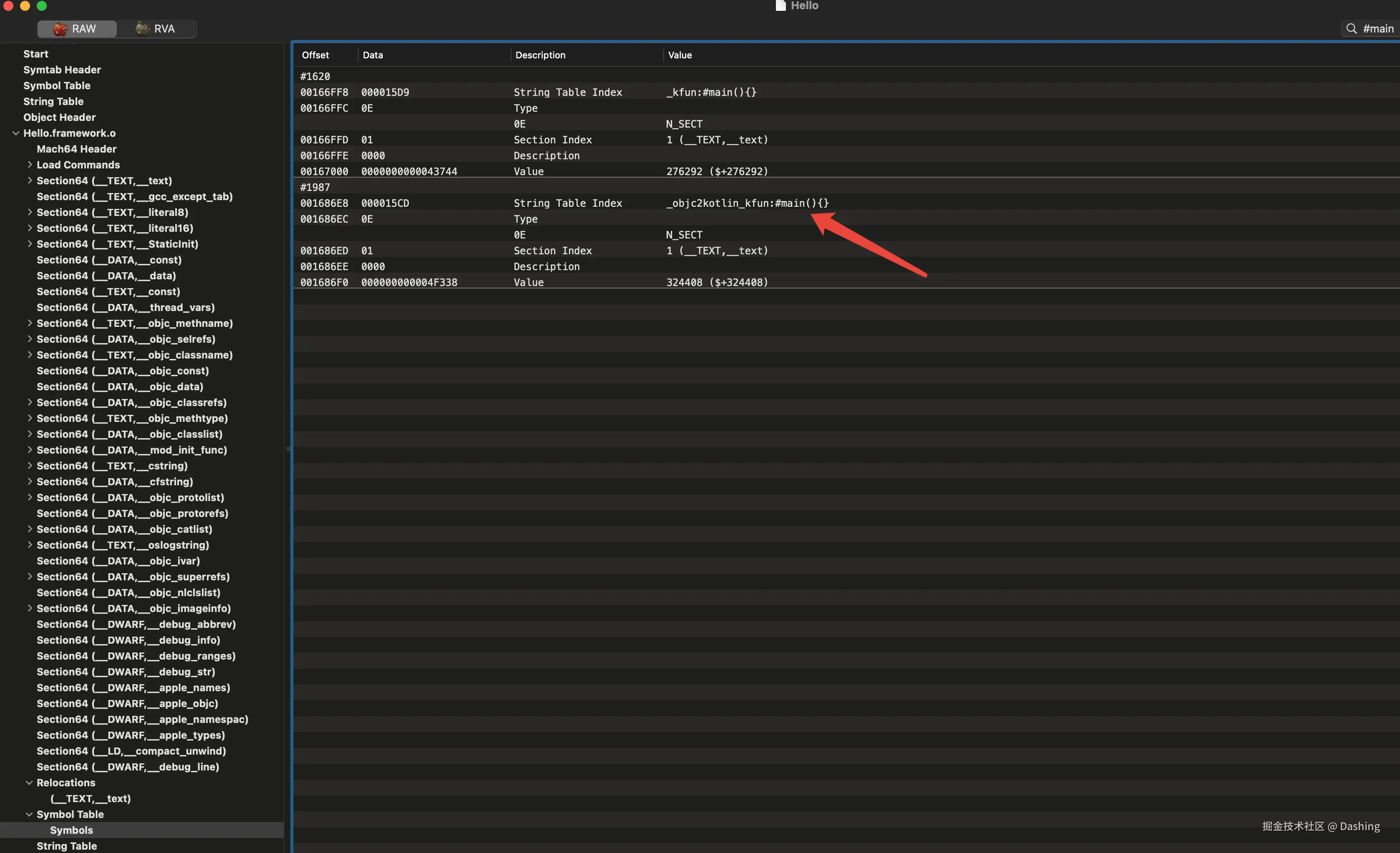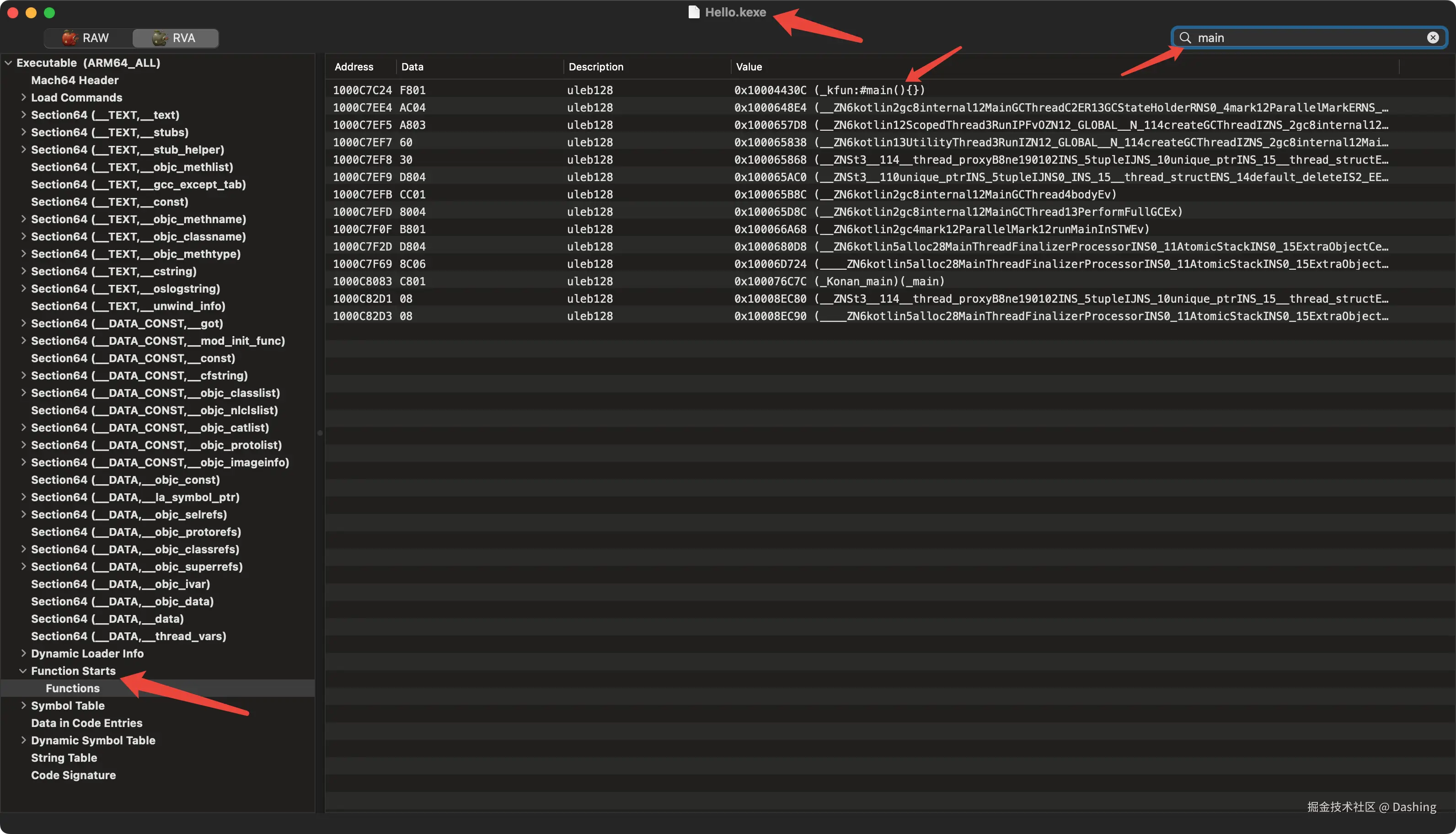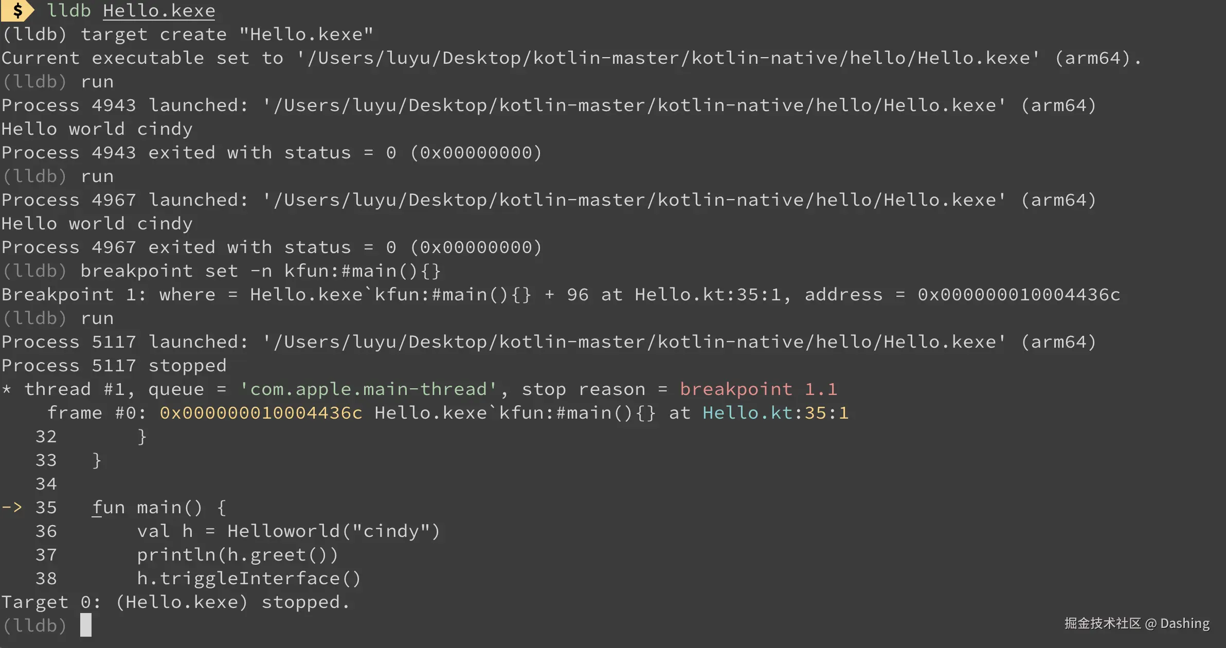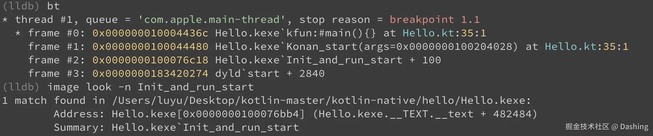 使用MachOView打开Hello.kexe,搜索main函数,发现函数符号名为kfun:#main(){},可以使用lldb调试看看: