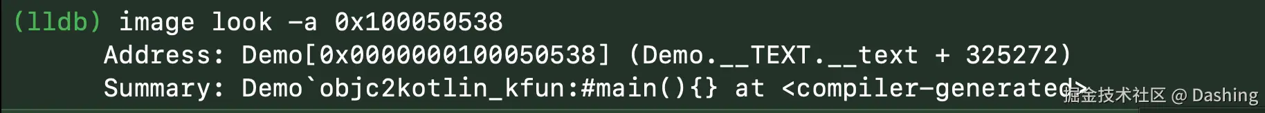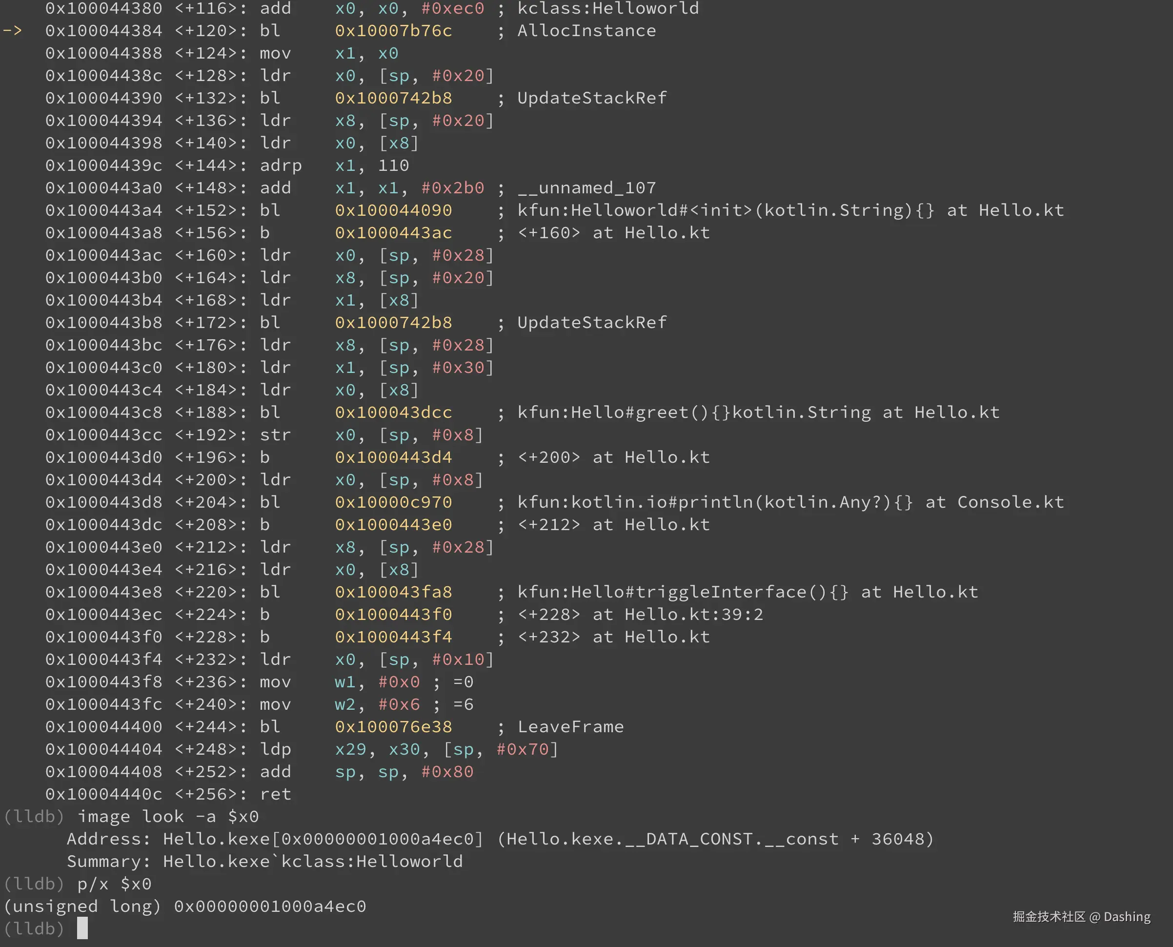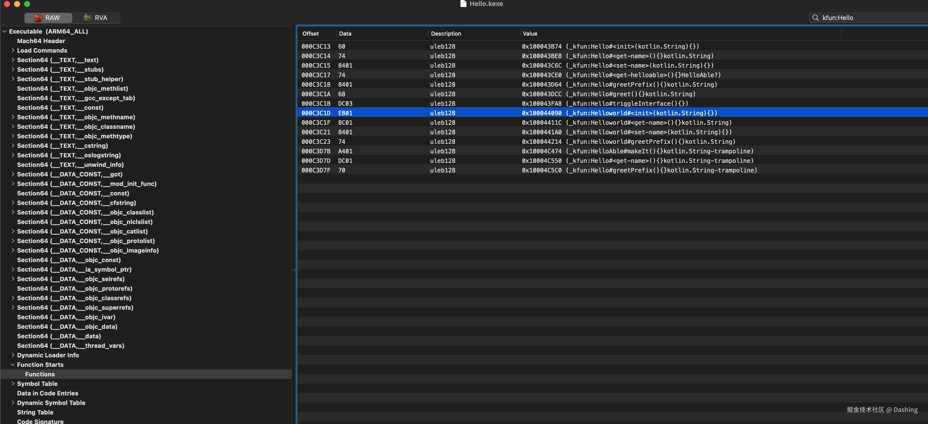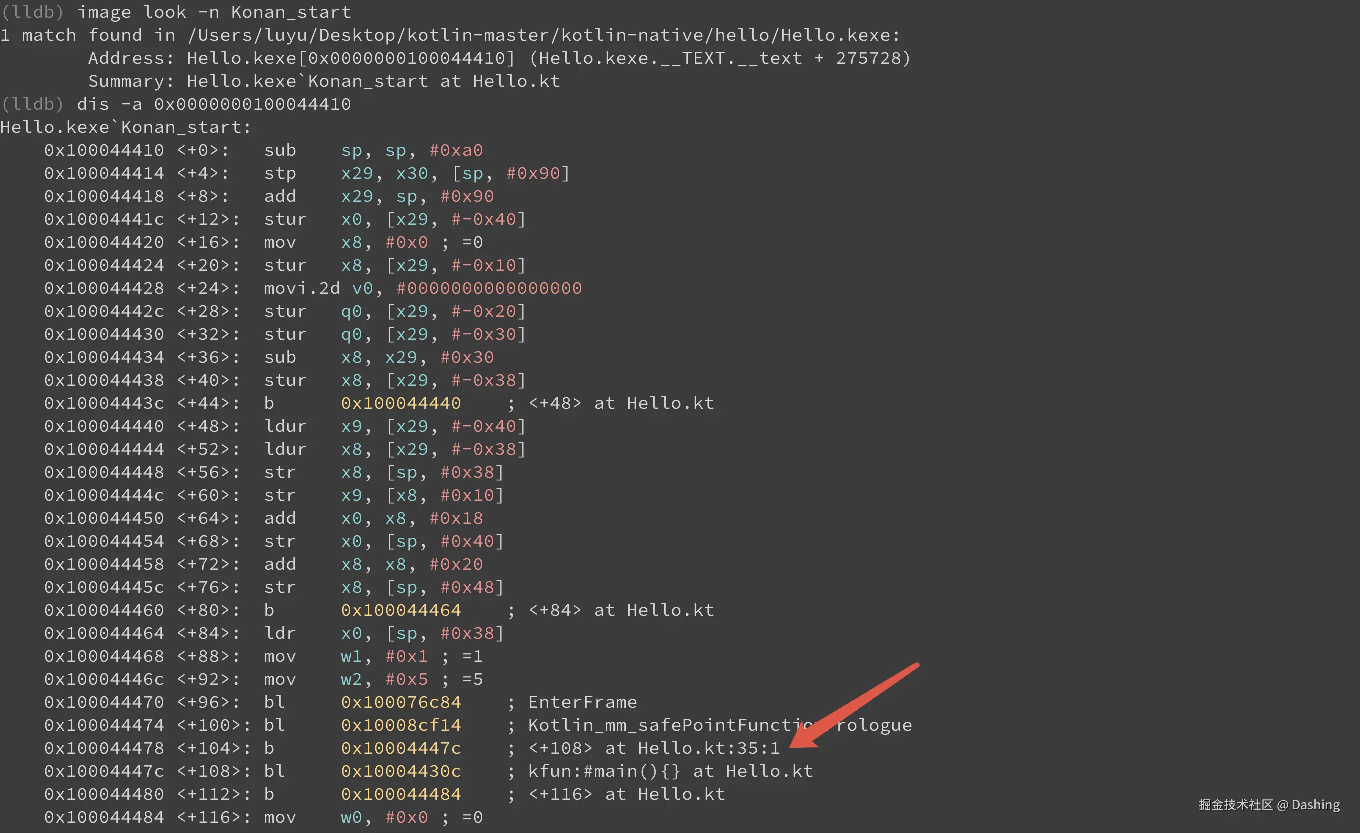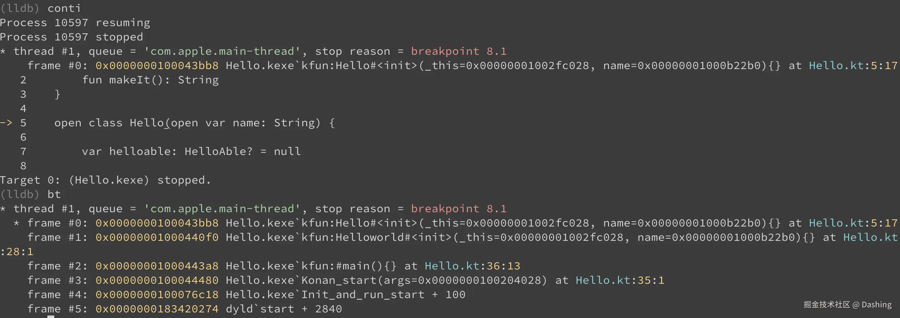 使用MachOView打开Hello.kexe,搜索main函数,发现函数符号名为kfun:#main(){},可以使用lldb调试看看: