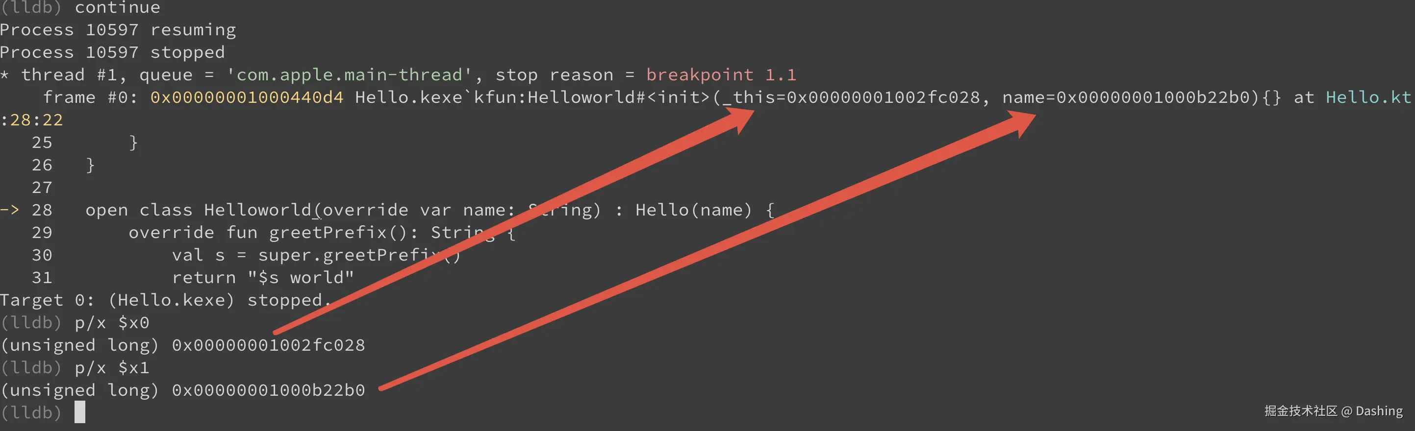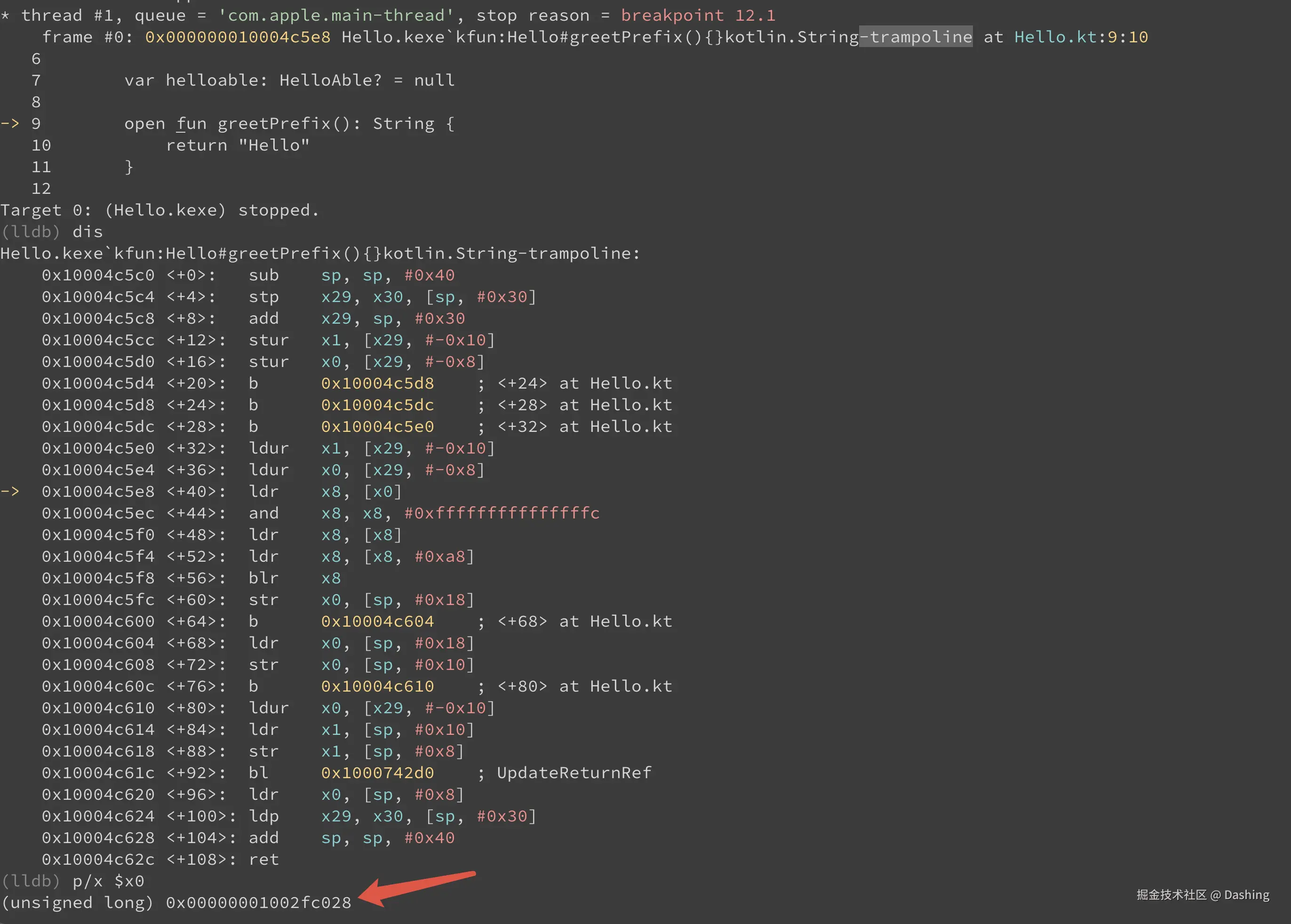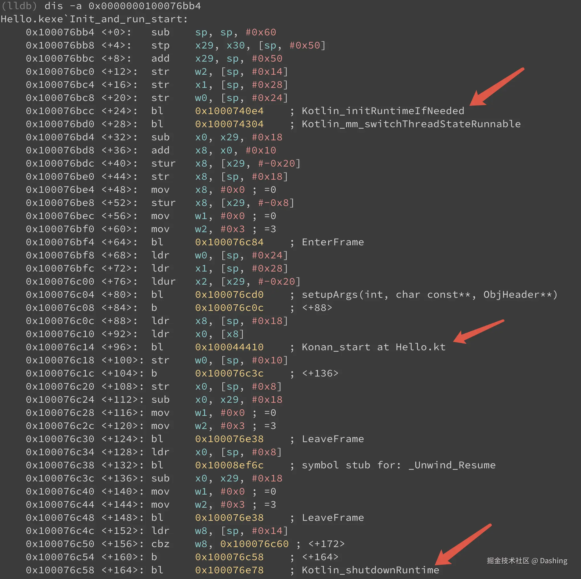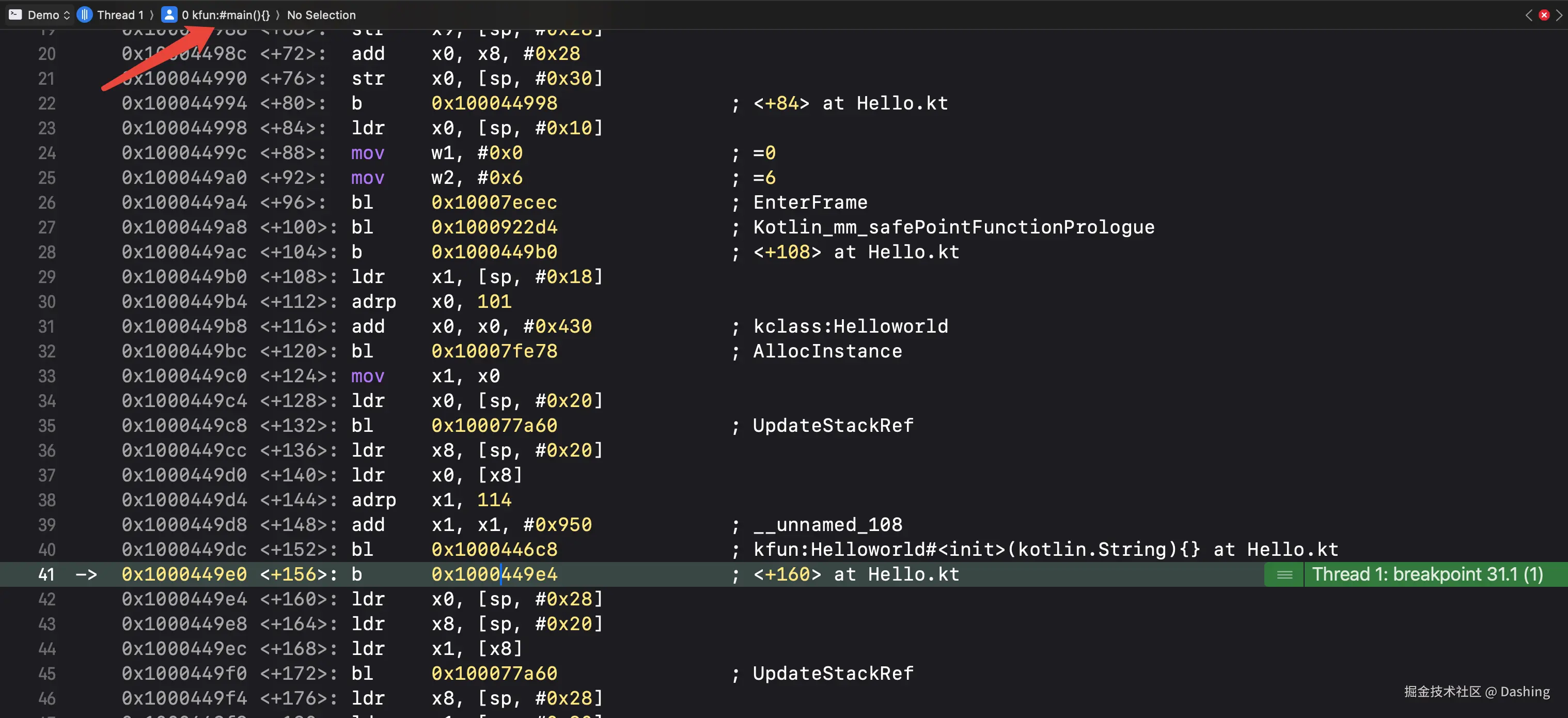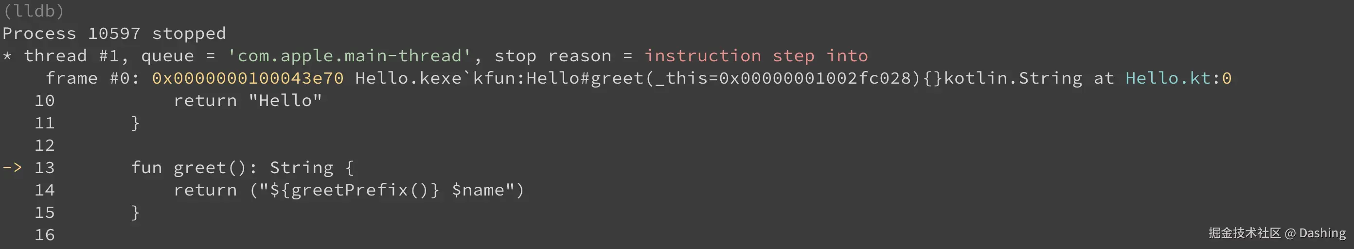 使用MachOView打开Hello.kexe,搜索main函数,发现函数符号名为kfun:#main(){},可以使用lldb调试看看: