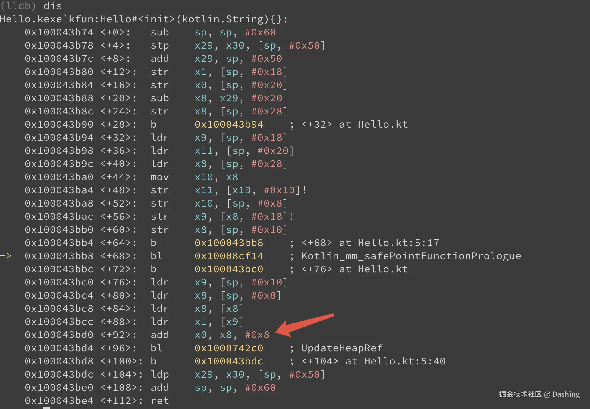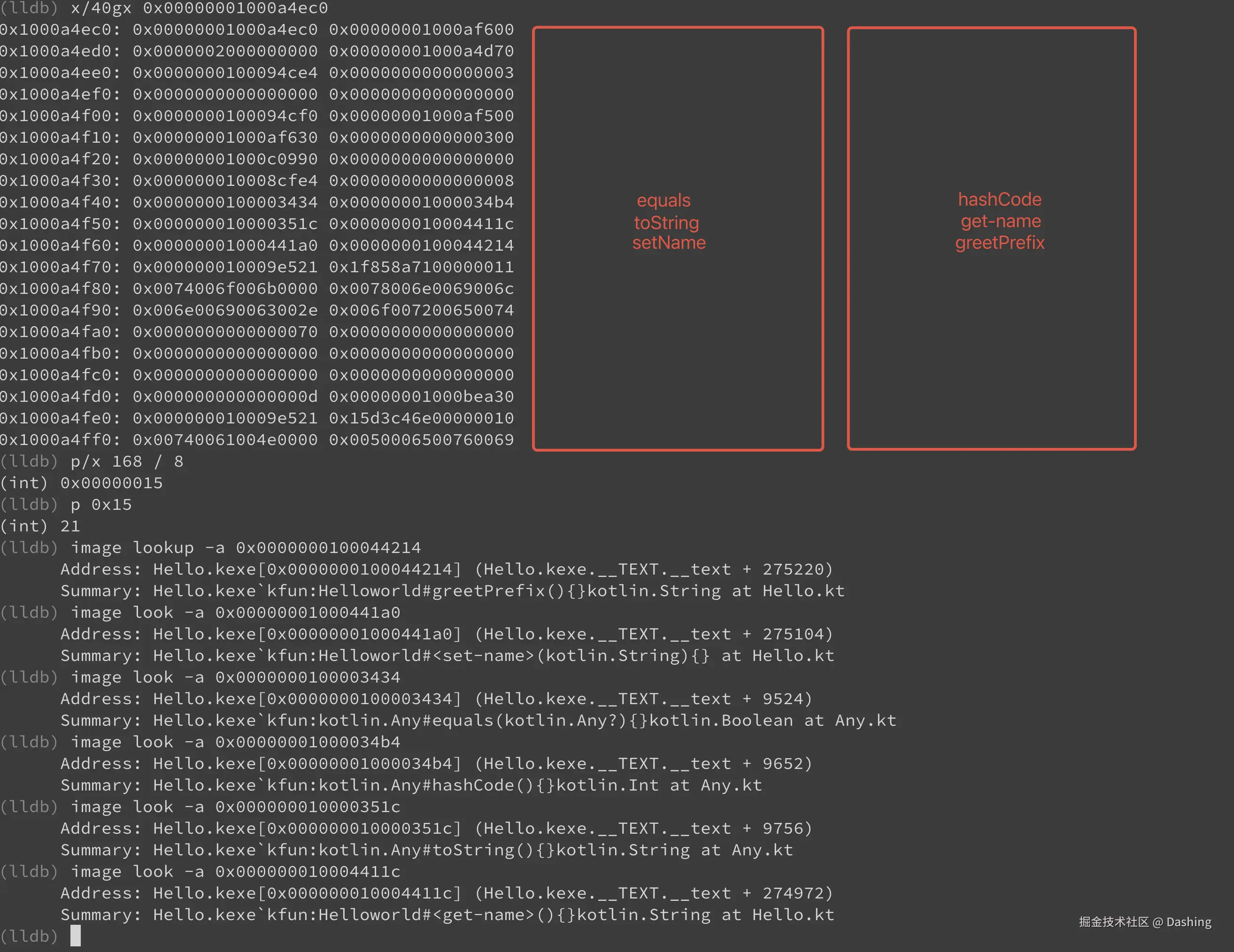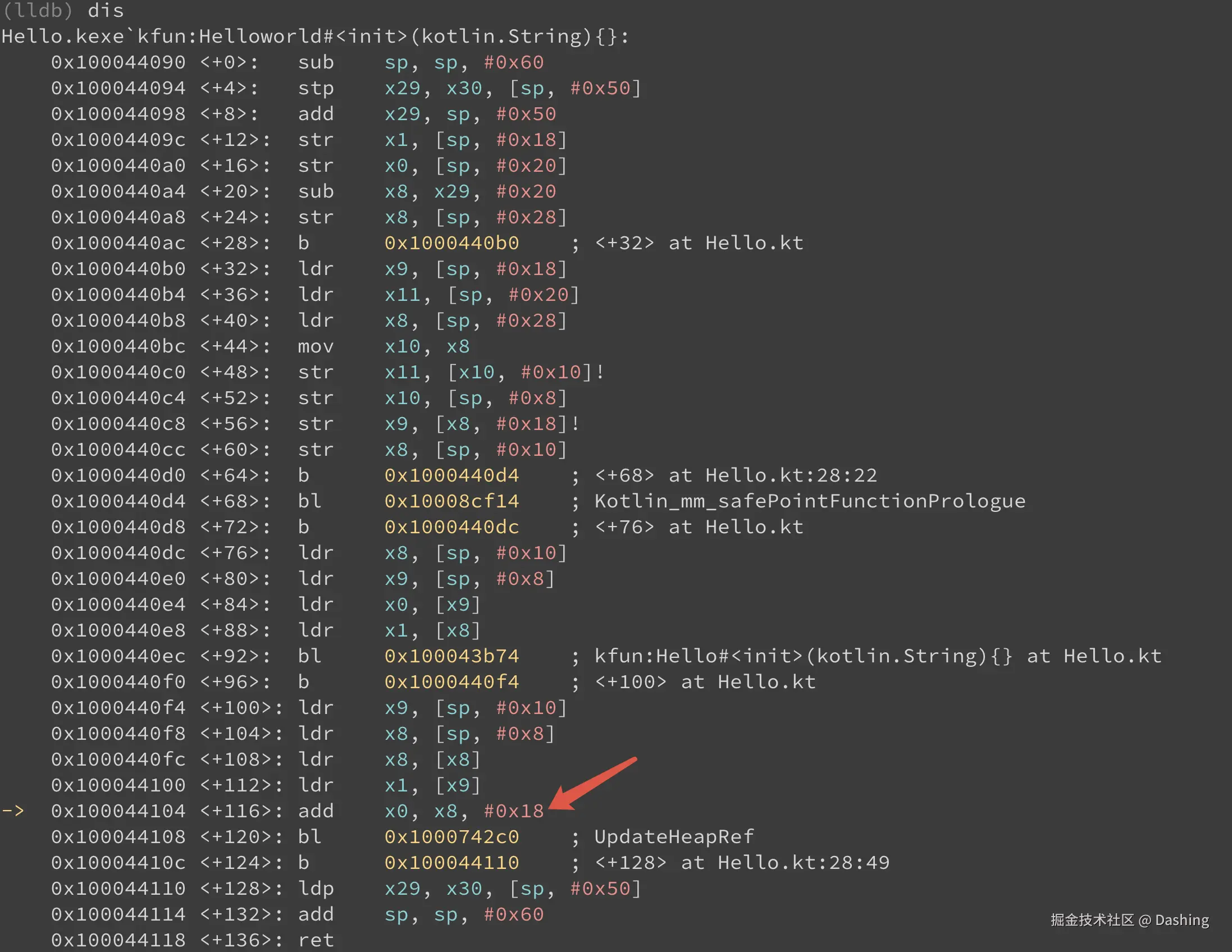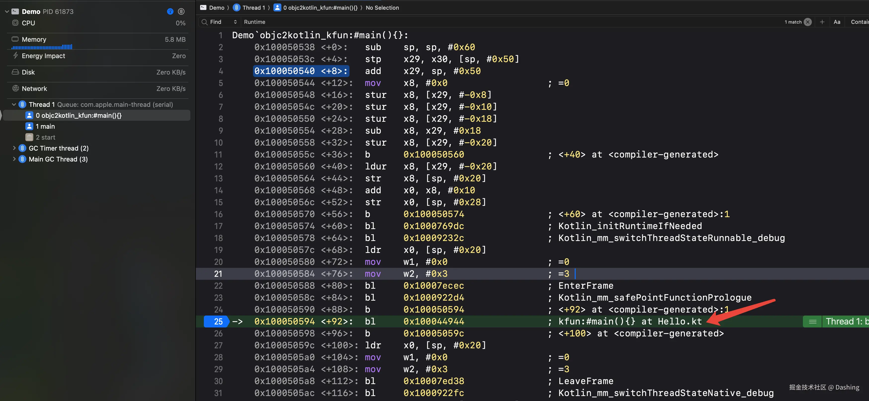使用MachOView打开Hello.kexe,搜索main函数,发现函数符号名为kfun:#main(){},可以使用lldb调试看看: