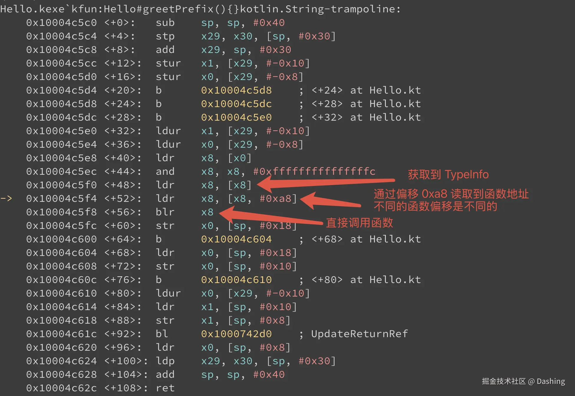 ○ 调用 KO1 makeIt 方法 kfun:HelloAble#makeIt(){}kotlin.String-trampoline -trampoline 后缀的方法是需要通过 TypeInfo 读虚表(此TypeInfo是上面动态创建的,创建的时候设置好了虚表)来确定调用最终的函数为kotlin2objc_kfun:HelloAble#makeIt(){}kotlin.String