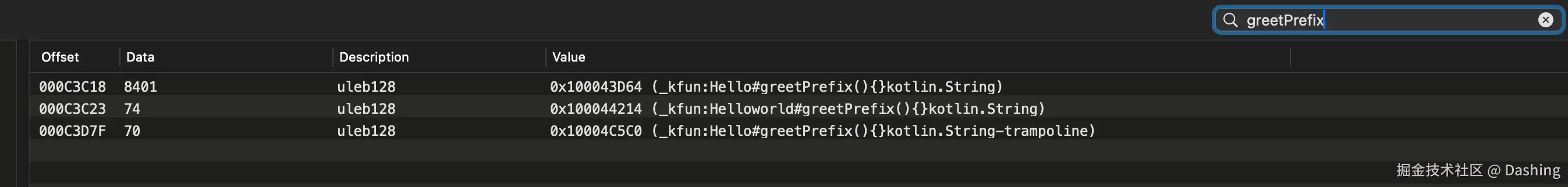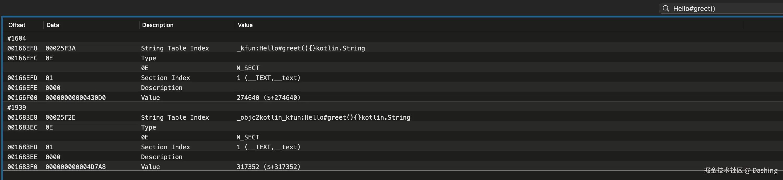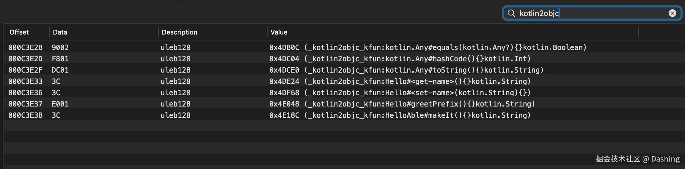 查看二进制文件符号,发现每个成员方法也生成了对应的objc2kotlin前缀的函数,例如: