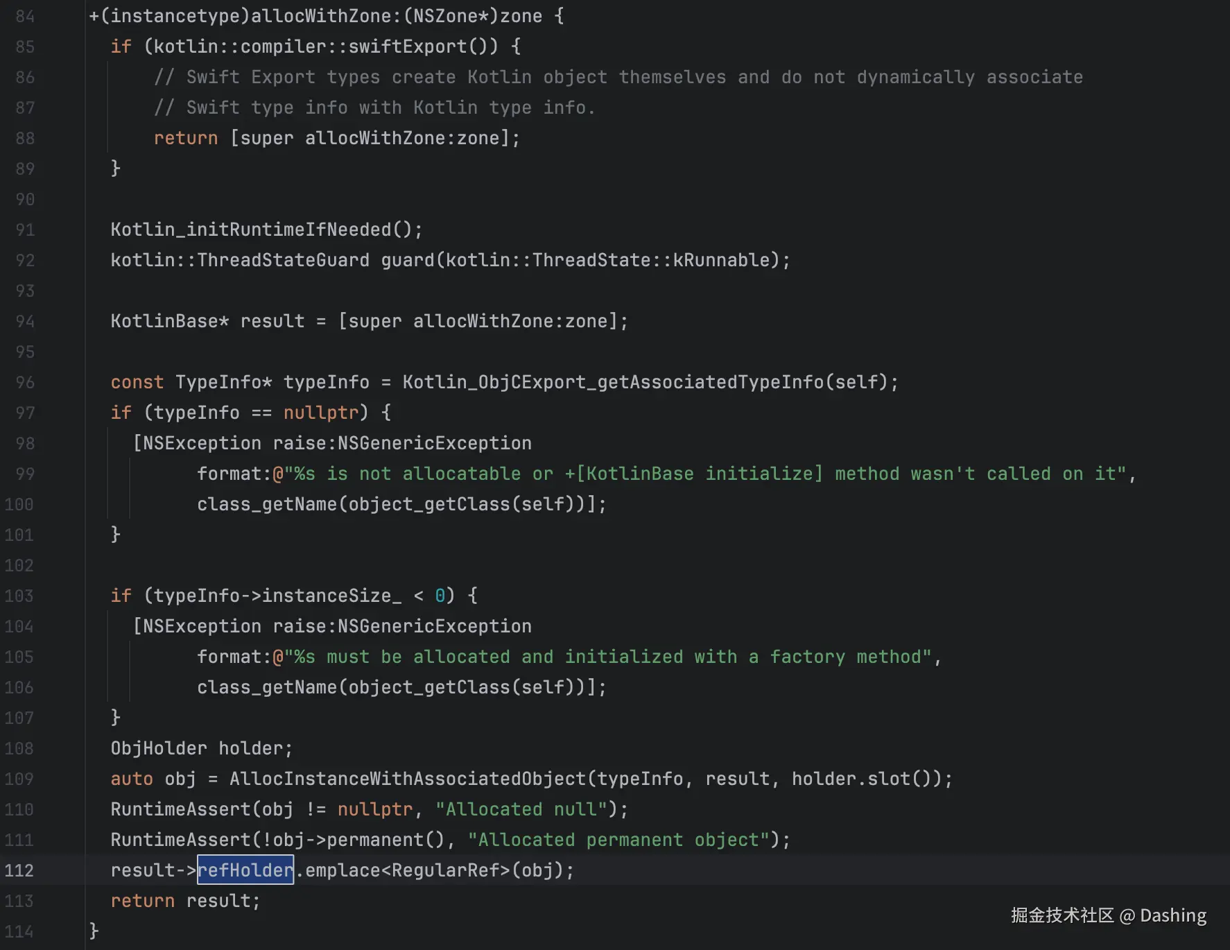 ● alloc 过程:有两个分配内存的过程(创建了两个对象),OC 侧跟Kotlin侧个创建了一个对象,并且把两个对象绑定起来了(互相持有引用),通过其中任意一个对象,可以轻松获取到对侧的对象