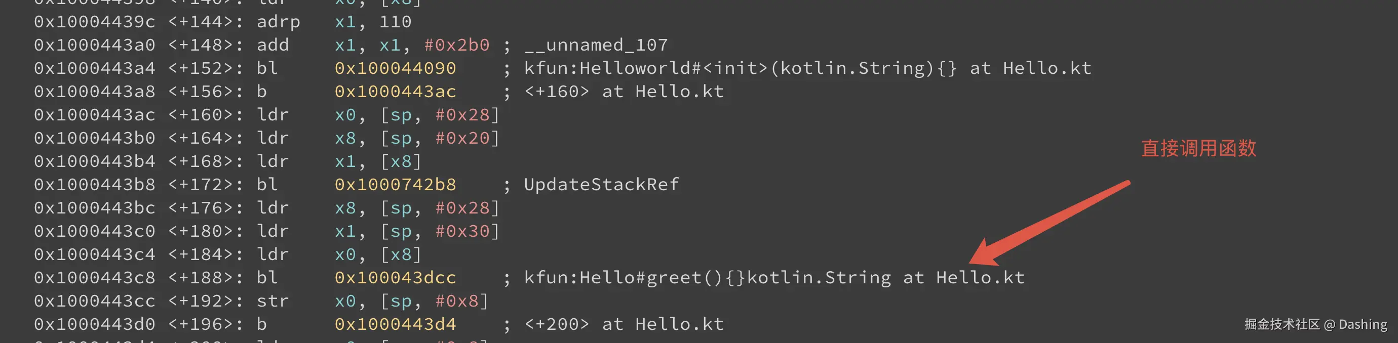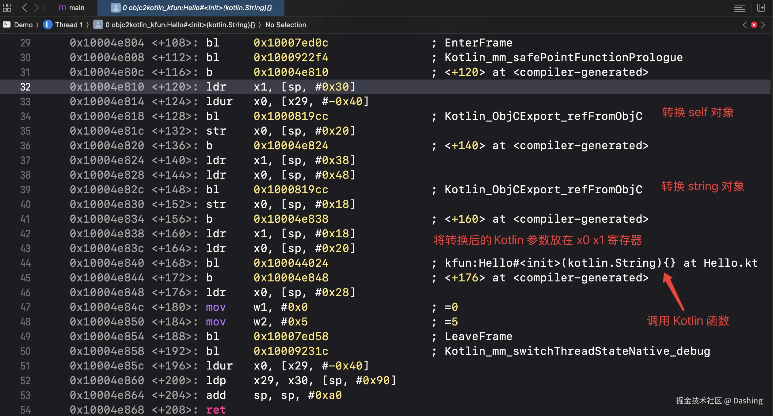 ● init 过程:给上述Alloc获取的对象发消息,SEL='initWithName',对应的实现是objc2kotlin_kfun:Hello#<init>(kotlin.String){}函数,函数中self对象跟NSString 通过 toKotlin: 转换为 Kotlin 侧的对象,并作为调用 kfun:Hello#<init>(kotlin.String){}函数的参数