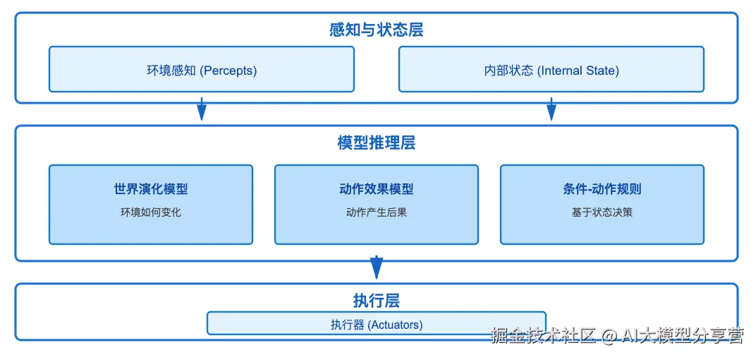 关键是"我认为"——智能体通过内部模型推理无法直接观测的环境状态。比如转过墙角后,它仍然"记得"墙后的布局,这就是模型推理能力。