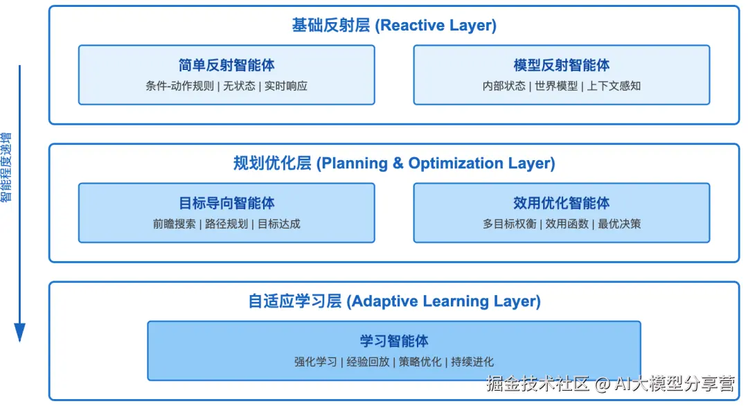 五种智能体类型构成了从基础到高级的完整技术谱系,如下图所示:
