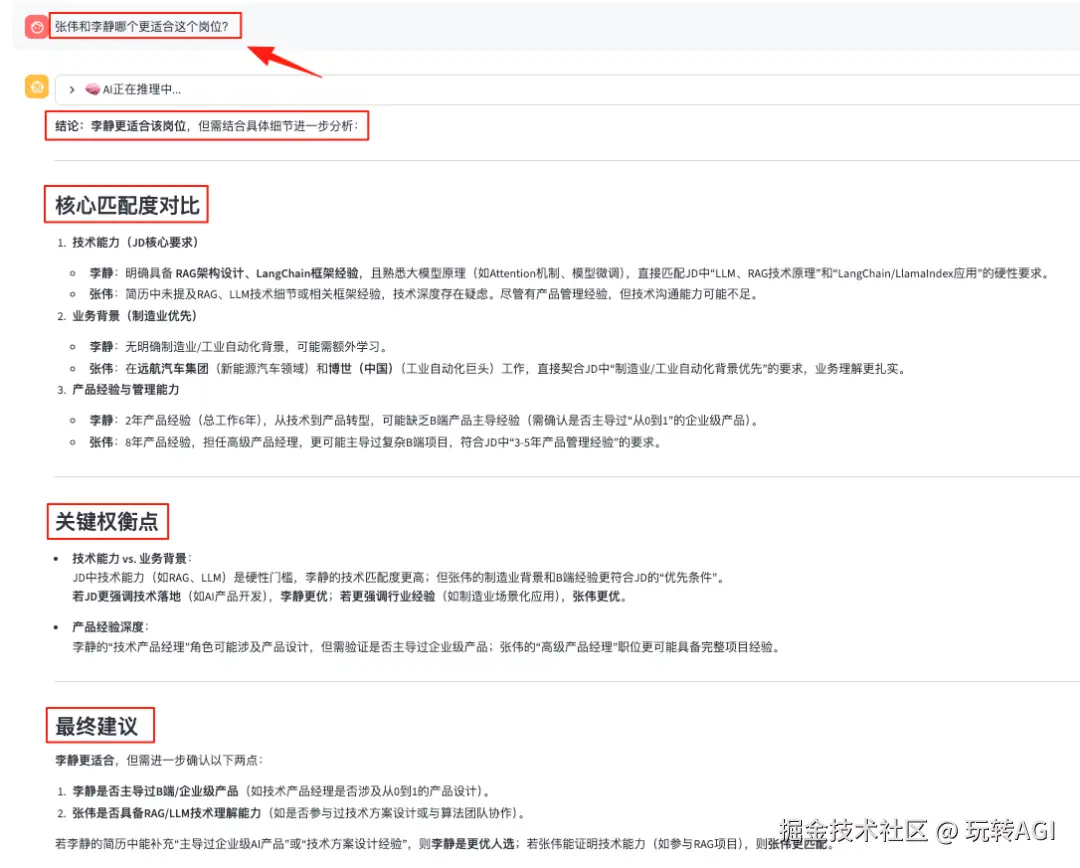 招聘决策的关键在于对多个候选人进行标准化的横向对比。这也就要求智能简历筛选系统不仅能找到信息,更能以结构化且一目了然的方式,展示每个候选人的评估档案。例如,自动生成所有候选人的核心能力对比列表。以及进一步支持招聘人员通过连续的追问,这要求系统具备上下文记忆和深度推理的能力。
