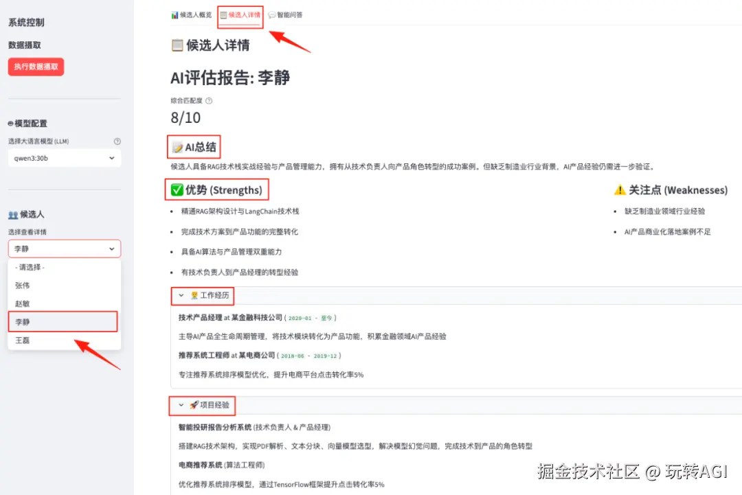 在候选人概览视图的基础上,招聘人员可以对感兴趣的候选人进行进一步了解。比如在左侧边栏的“候选人”下拉列表中选择“李静”,并切换到“候选人详情”标签页后,系统会呈现一份由 AI 自动生成的完整评估报告。