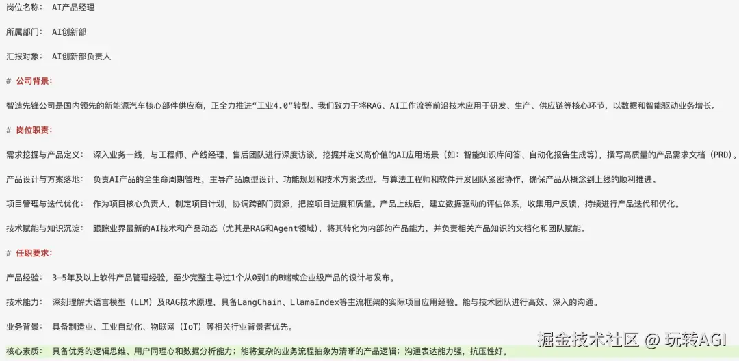 所有筛选和评估逻辑围绕“AI 产品经理”职位展开。该岗位主要负责 RAG、AI 工作流等前沿技术在新能源汽车制造领域的产品化应用。具体查看下面截图
