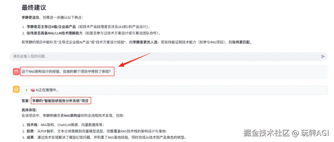系统成功地理解了代词“她”(指代李静)和上下文中提及的“RAG 架构设计经验”,并精准地将这项抽象技能与“智能投研报告分析系统”这一具体项目关联起来。这有力地证明了 RunnableWithMessageHistory 组件的有效性,系统具备了真正连贯、有深度的对话能力。
