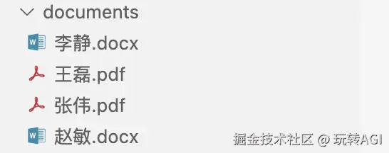 测试使用四份背景各异的候选人简历(人名为虚构),分别以 PDF 和 DOCX 格式存储。这四位候选人在关键评估维度上形成了很好的对比样本。